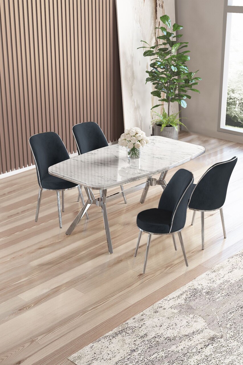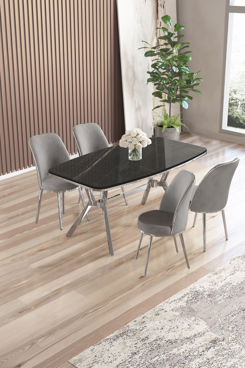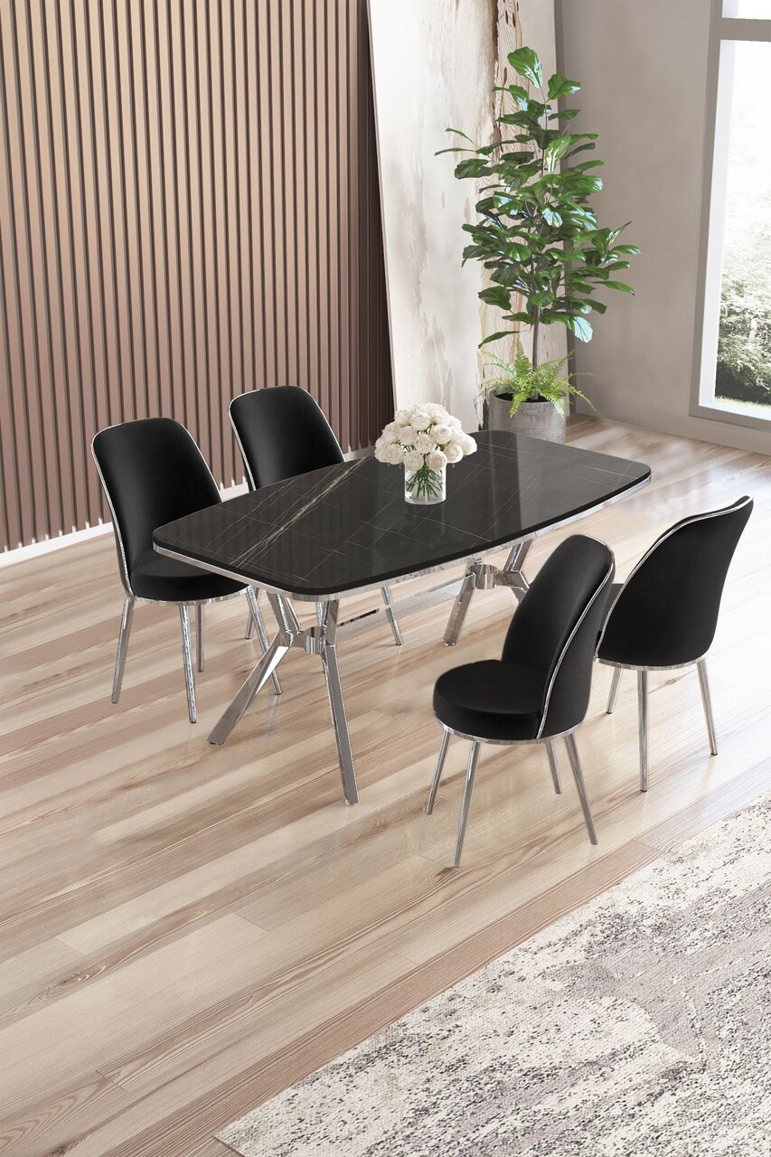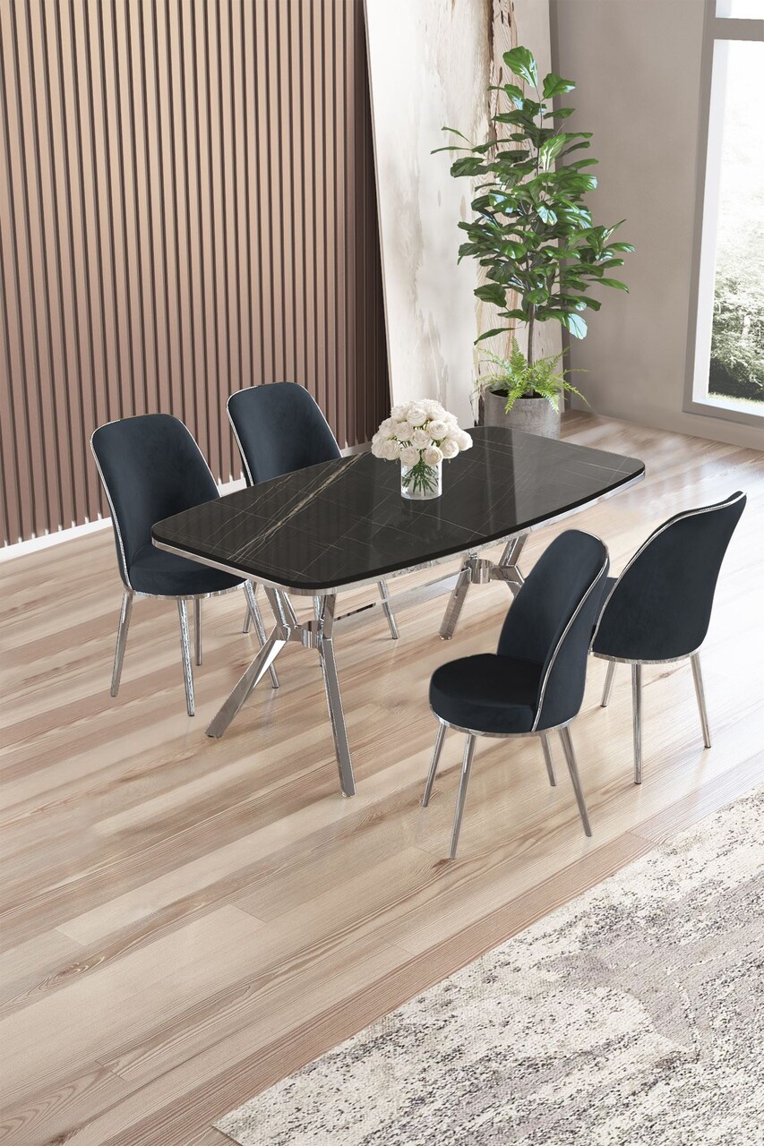 Set masă și scaune (5 bucăți), Hanah Home, Lena, Marmură neagră / Crom / Antracit
