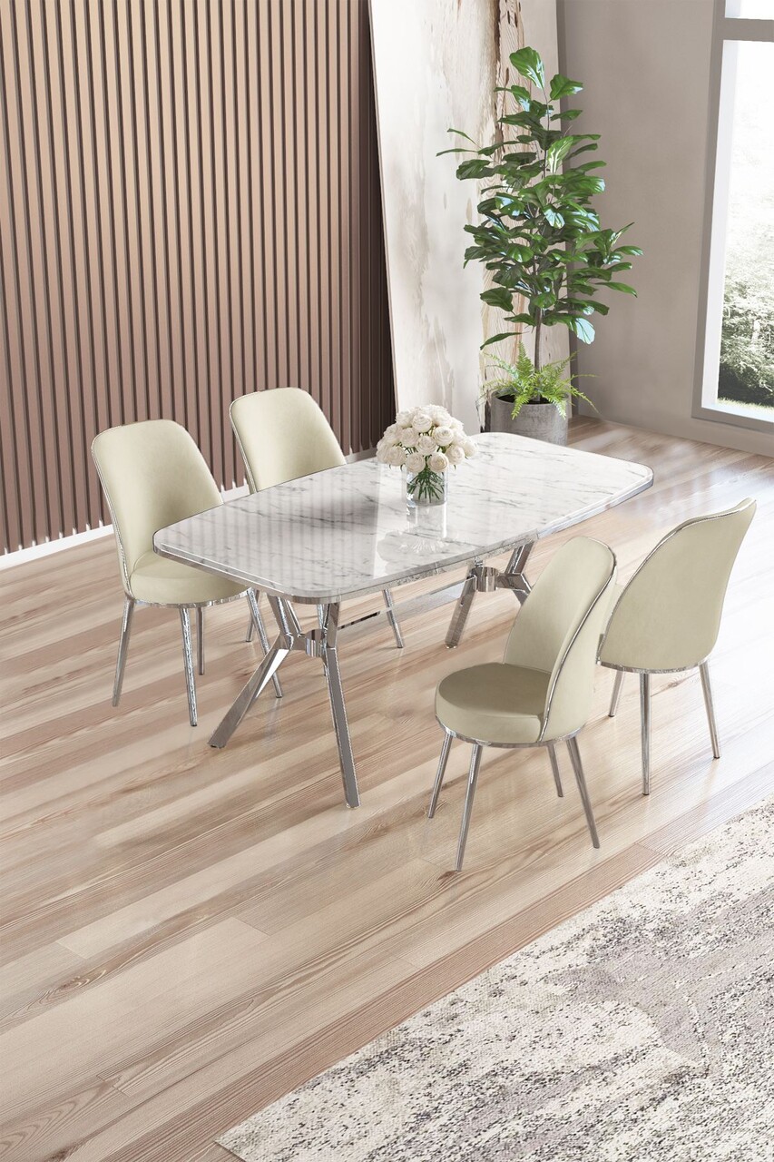 Set masă și scaune (5 bucăți), Hanah Home, Lena, Marmură albă / Crom / Crem