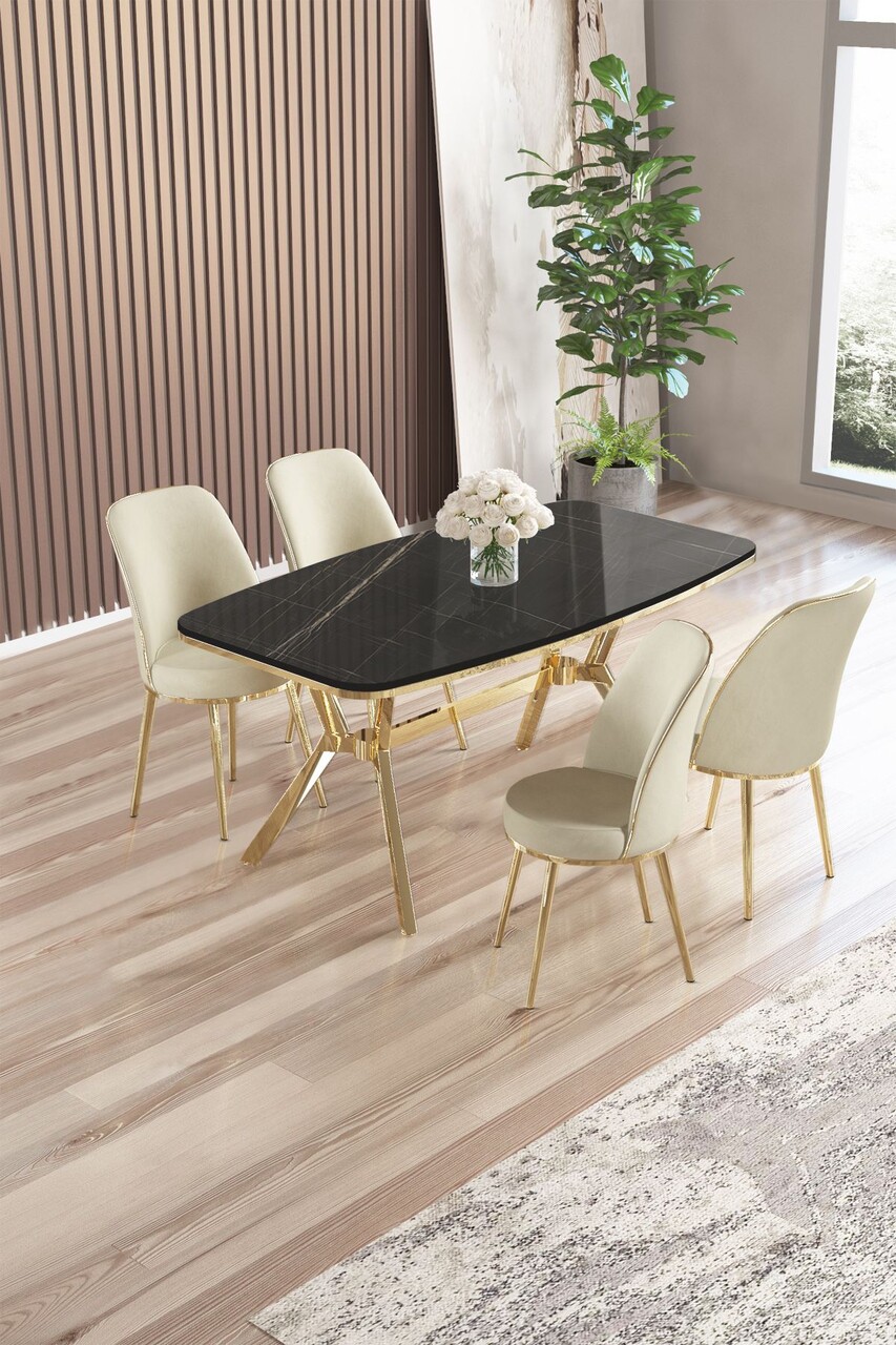 Set masă și scaune (5 bucăți), Hanah Home, Lena, Marmură neagră / Auriu / Crem
