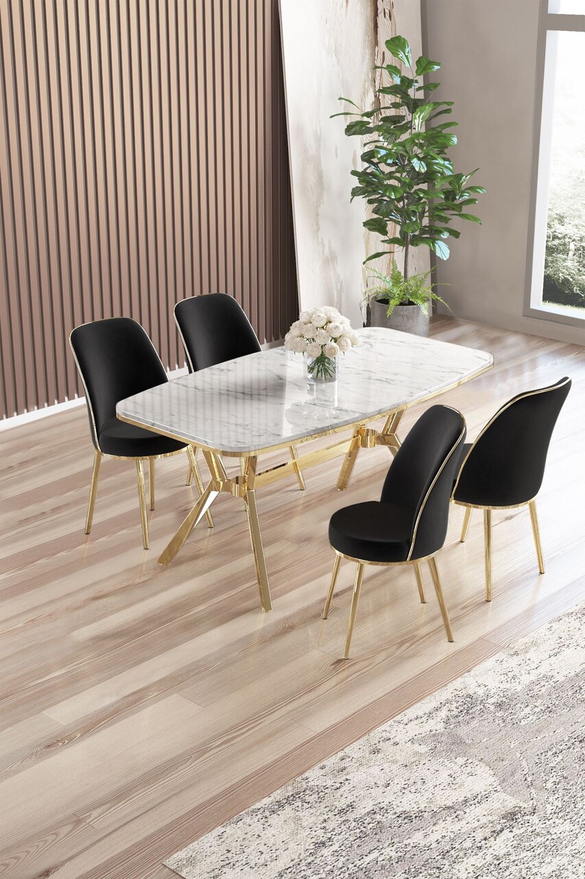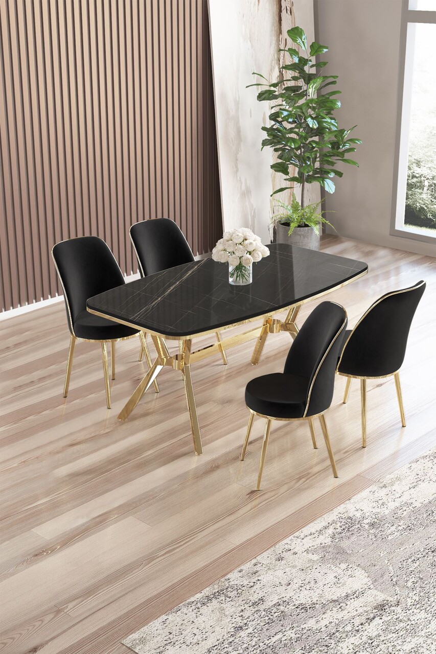 Set masă și scaune (5 bucăți), Hanah Home, Lena, Marmură neagră / Auriu / Negru