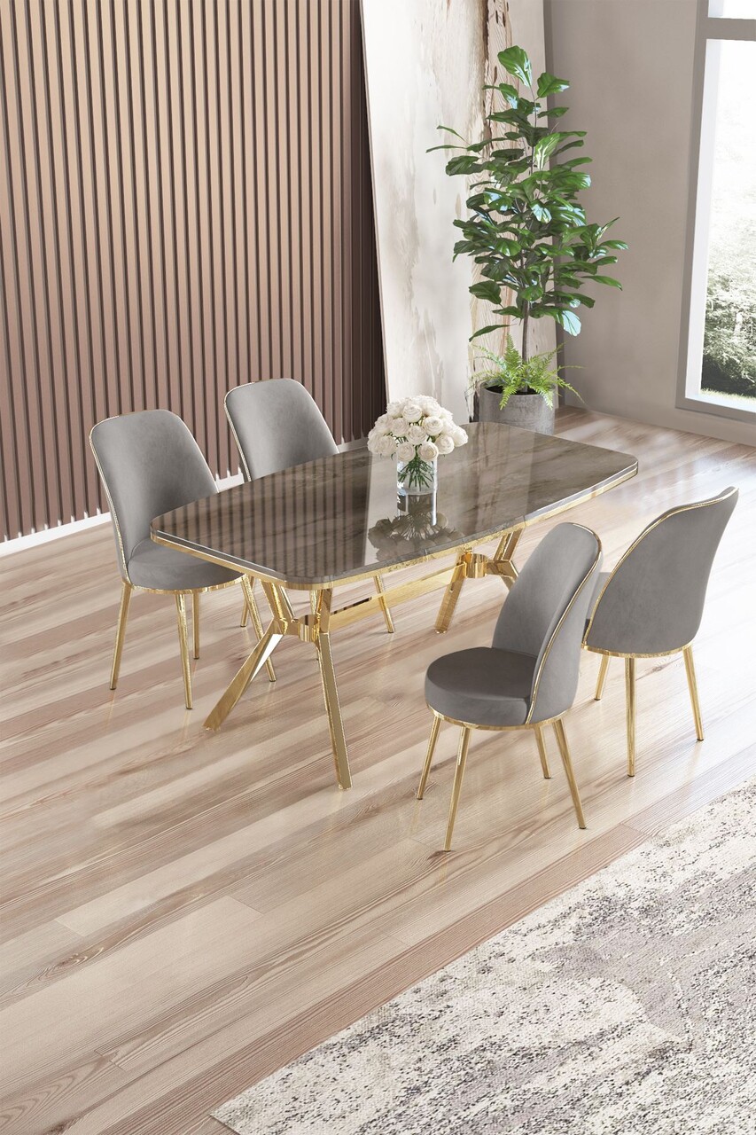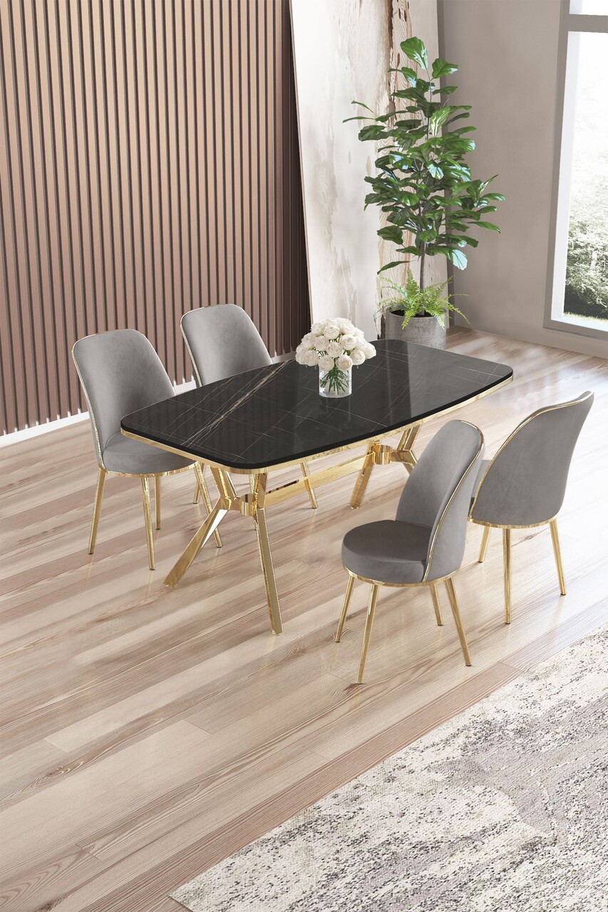 Set masă și scaune (5 bucăți), Hanah Home, Lena, Marmură neagră / Auriu / Gri