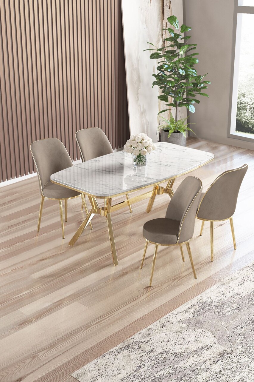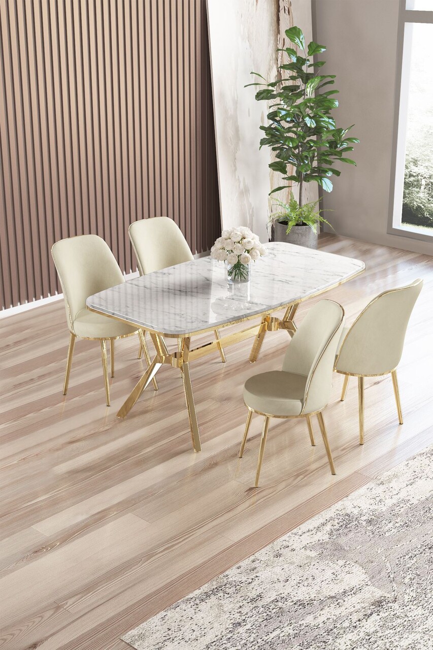Set masă și scaune (5 bucăți), Hanah Home, Lena, Marmură albă / Auriu / Cappuccino
