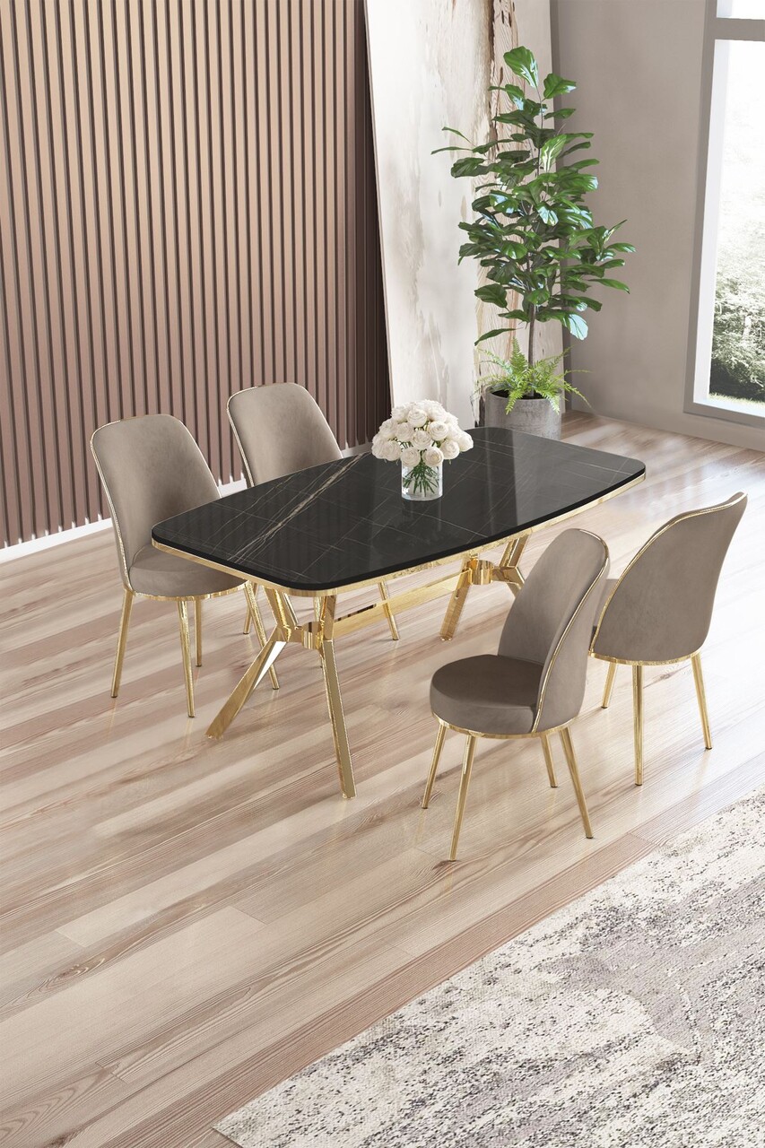 Set masă și scaune (5 bucăți), Hanah Home, Lena, Marmură neagră / Auriu / Cappuccino