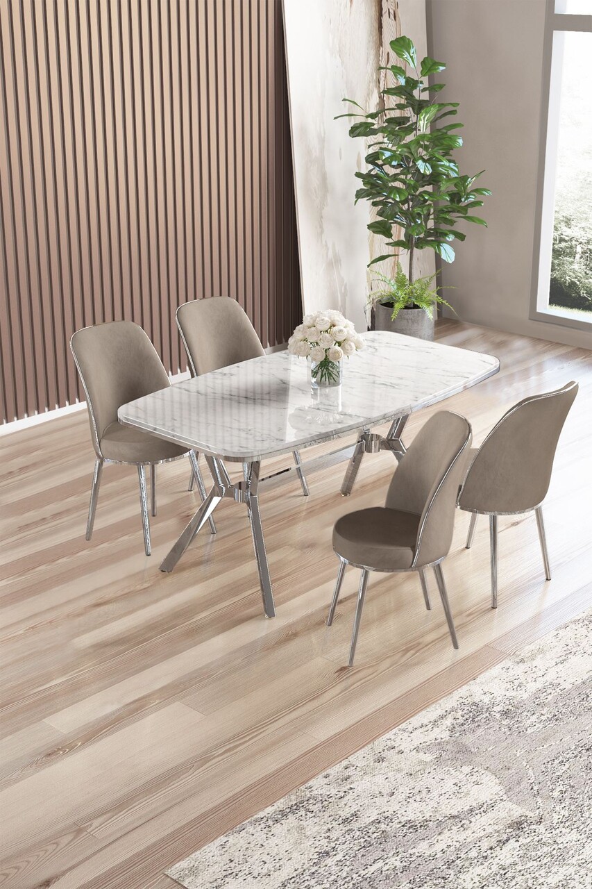 Set masă și scaune (5 bucăți), Hanah Home, Lena, Marmură albă / Crom / Cappuccino