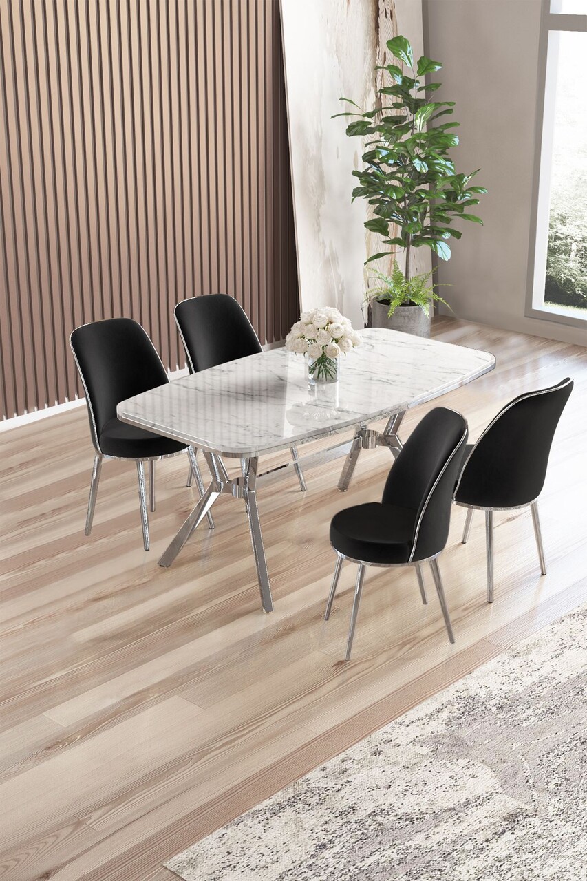 Set masă și scaune (5 bucăți), Hanah Home, Lena, MARMURĂ ALBĂ CROM / NEGRU