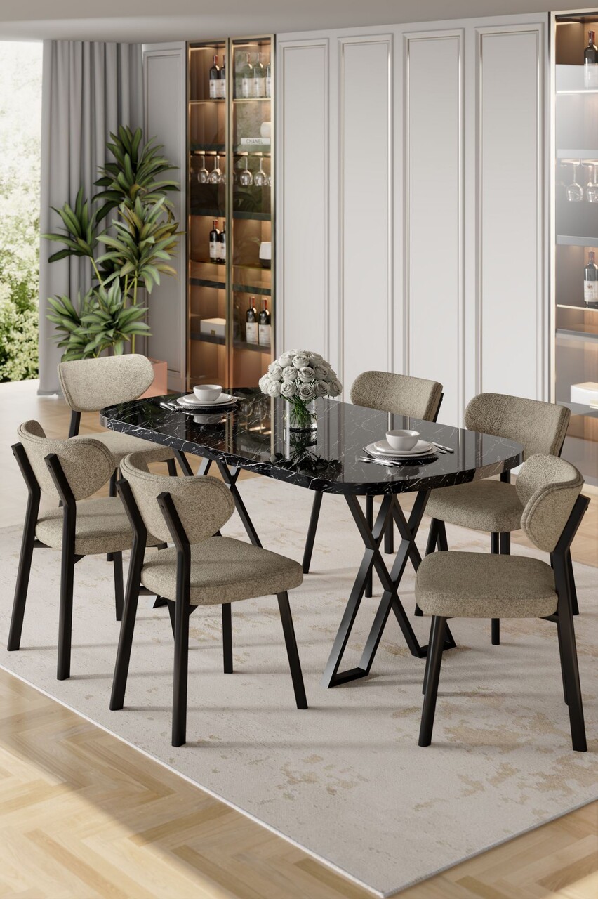 Set masă și scaune (7 piese), Hanah Home, Axton, Marmură neagră / Cappuccino