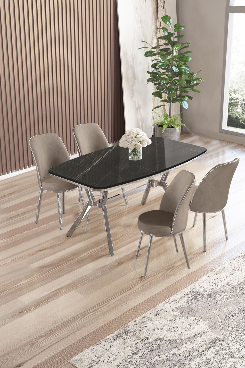 Set masă și scaune (5 bucăți), Hanah Home, Lena, Marmură neagră / Crom / Cappuccino