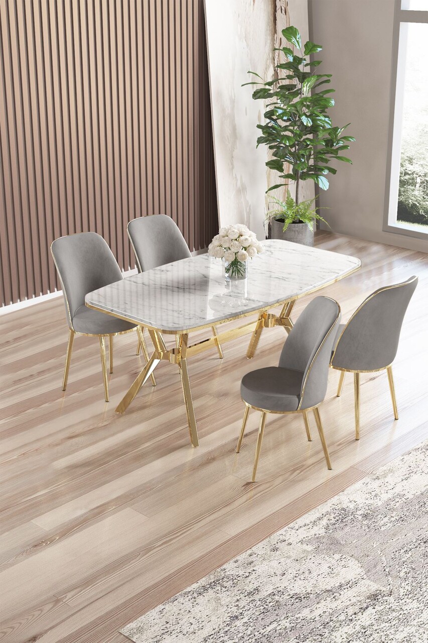 Set masă și scaune (5 bucăți), Hanah Home, Lena, Marmură albă / Auriu / Gri