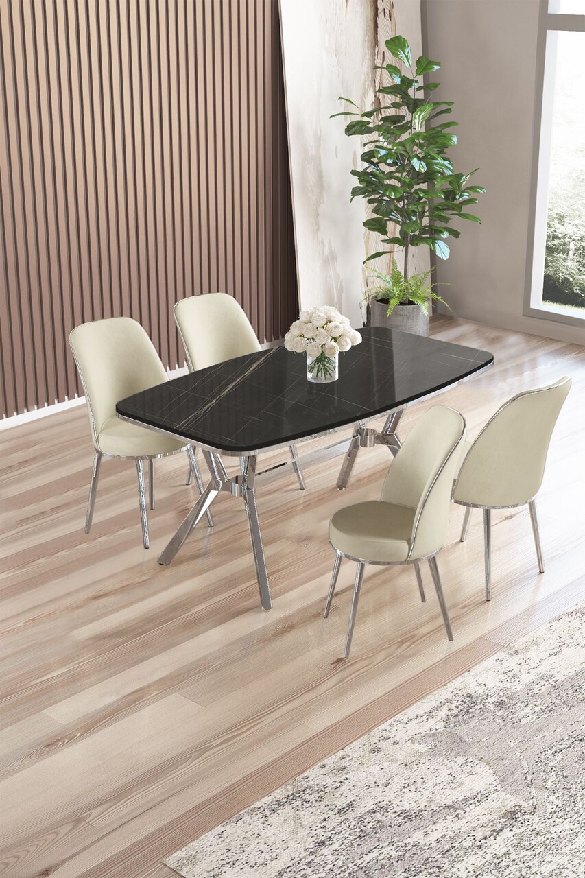 Set masă și scaune (5 bucăți), Hanah Home, Lena, Marmură neagră / Crom / Crem