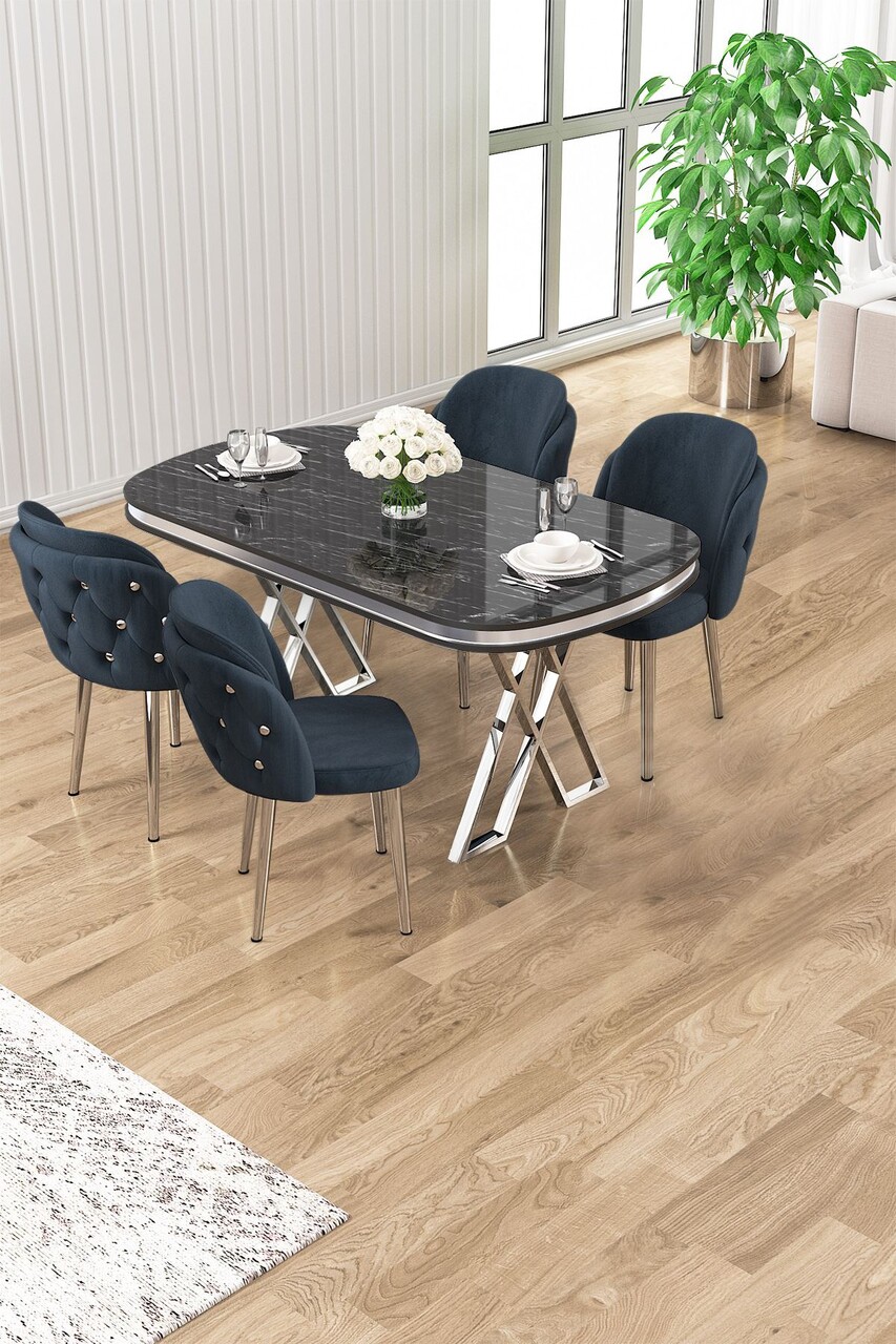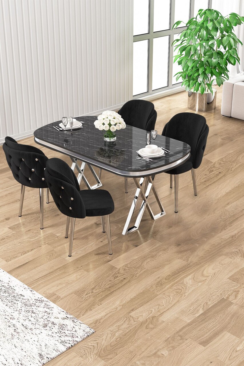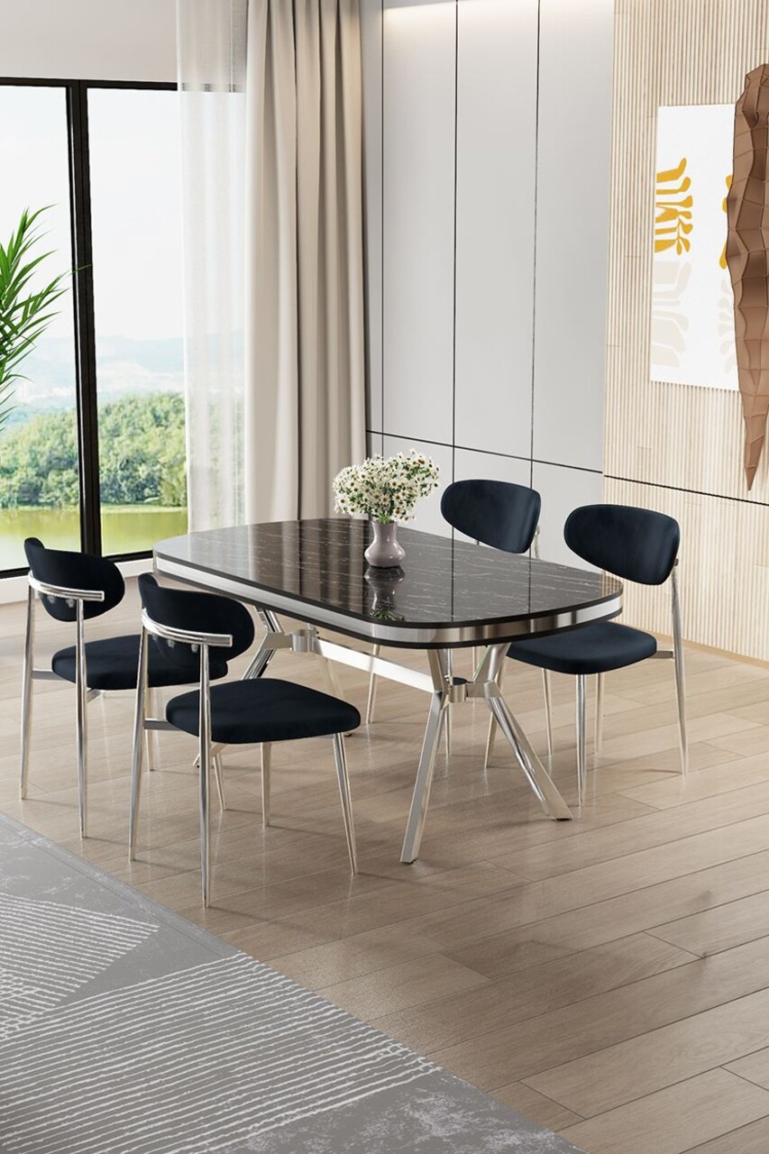 Set masă și scaune (5 bucăți), Hanah Home, Olya, Marmură neagră / Crom / Antracit