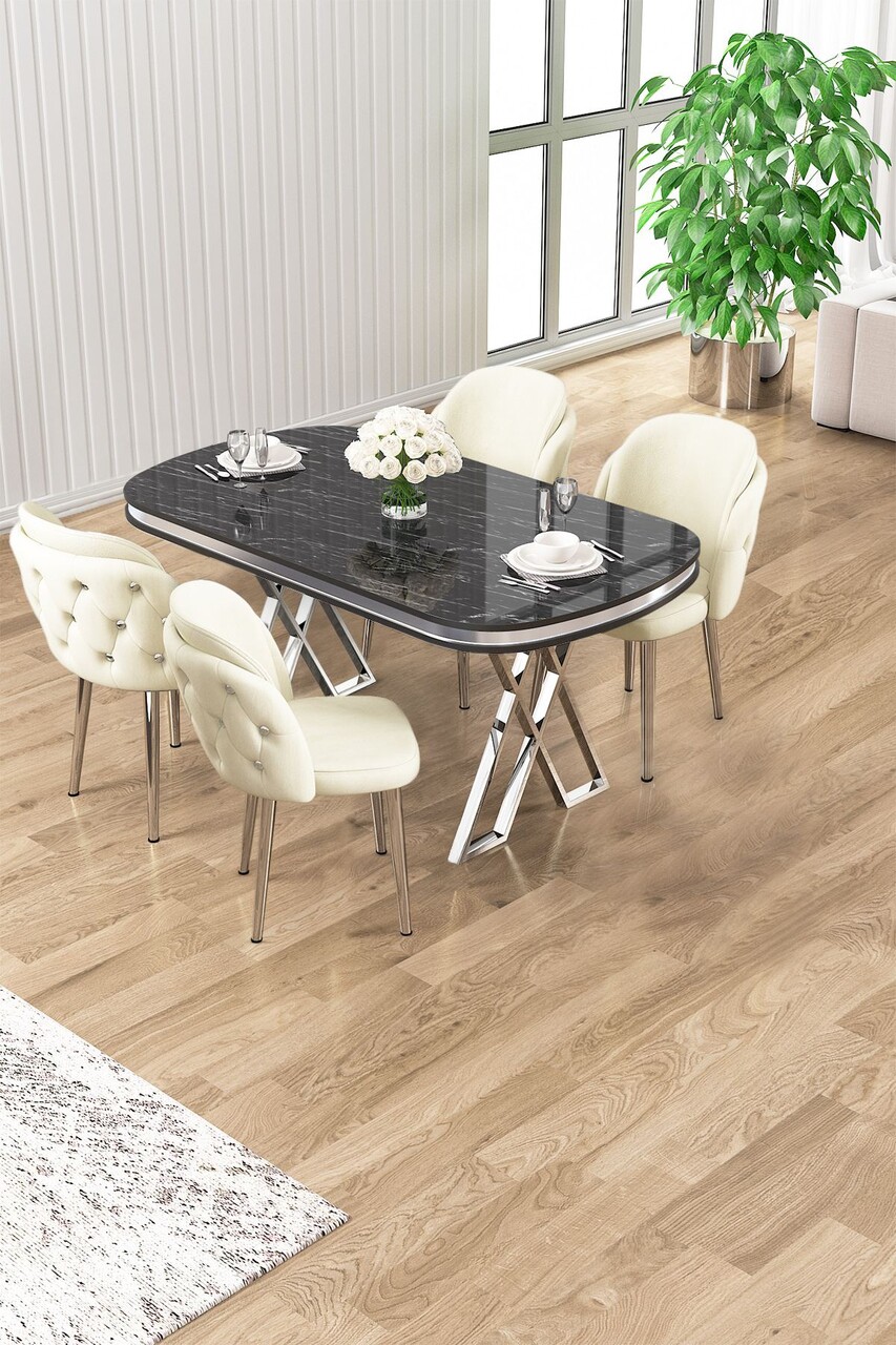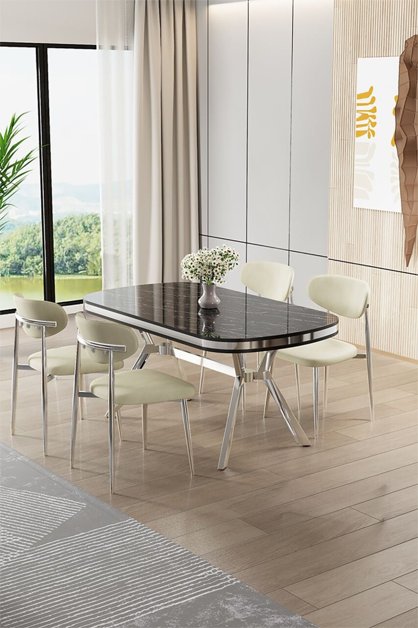 Set masă și scaune (5 bucăți), Hanah Home, Olya, Marmură neagră / Crom / Crem