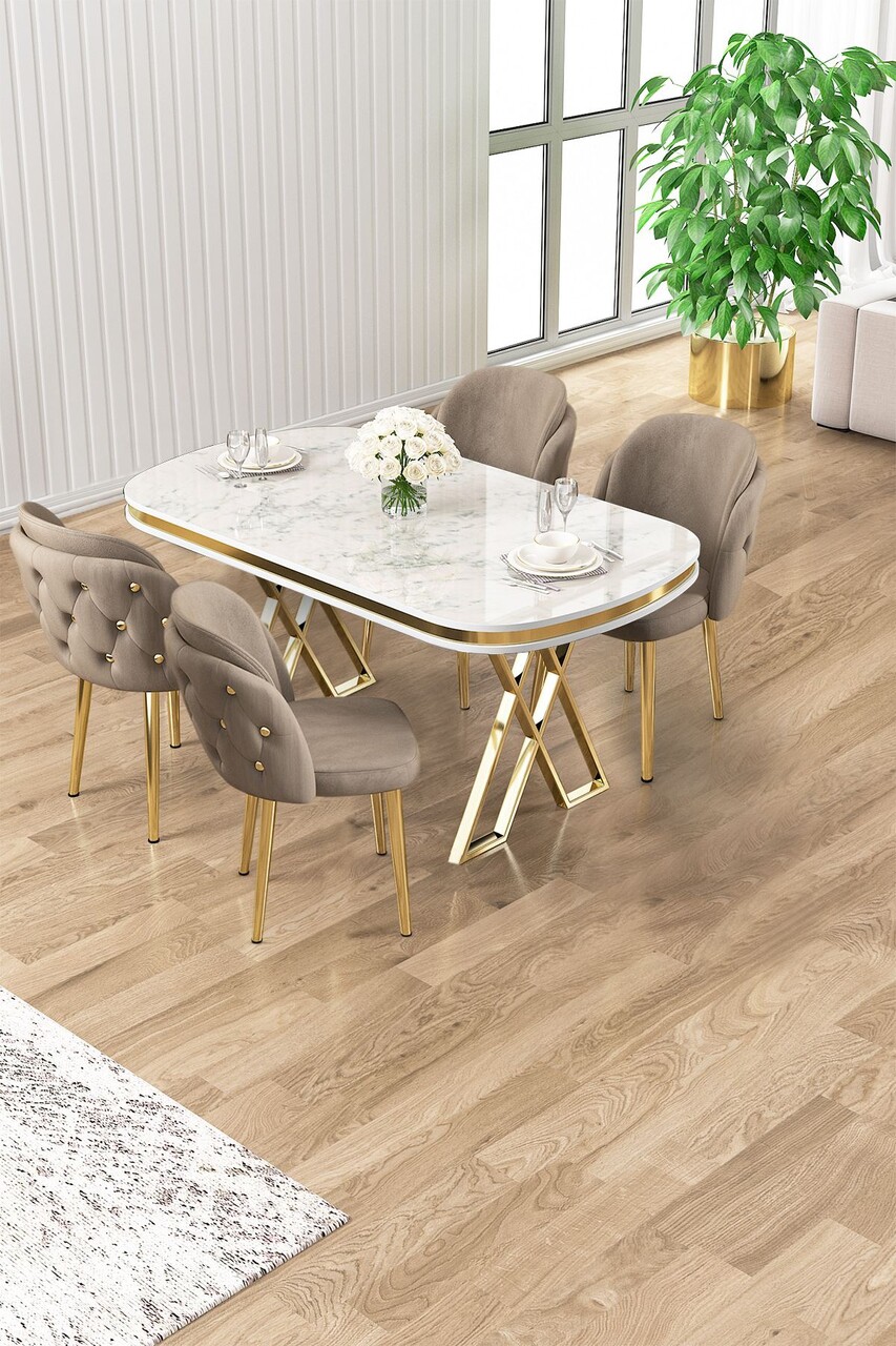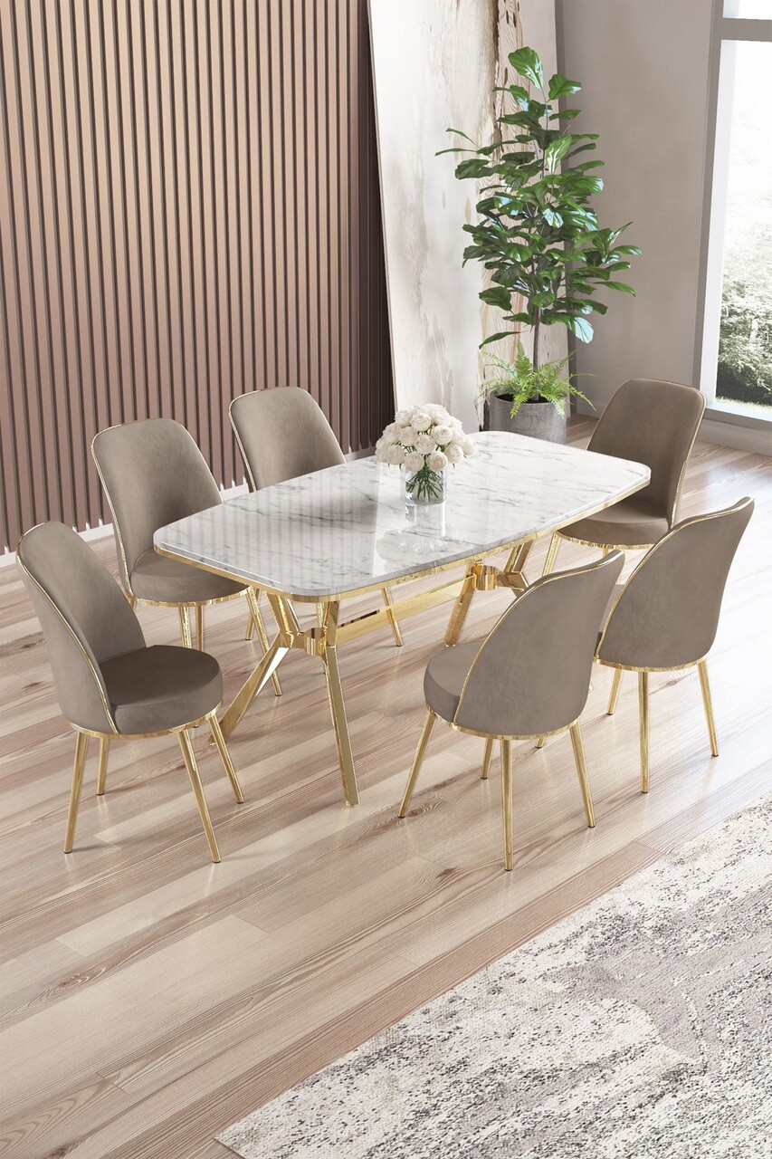 Set masă și scaune (7 piese), Hanah Home, Lena, Marmură albă / Auriu / Cappuccino