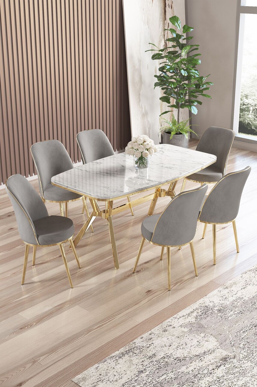 Set masă și scaune (7 piese), Hanah Home, Lena, Marmură albă / Auriu / Gri