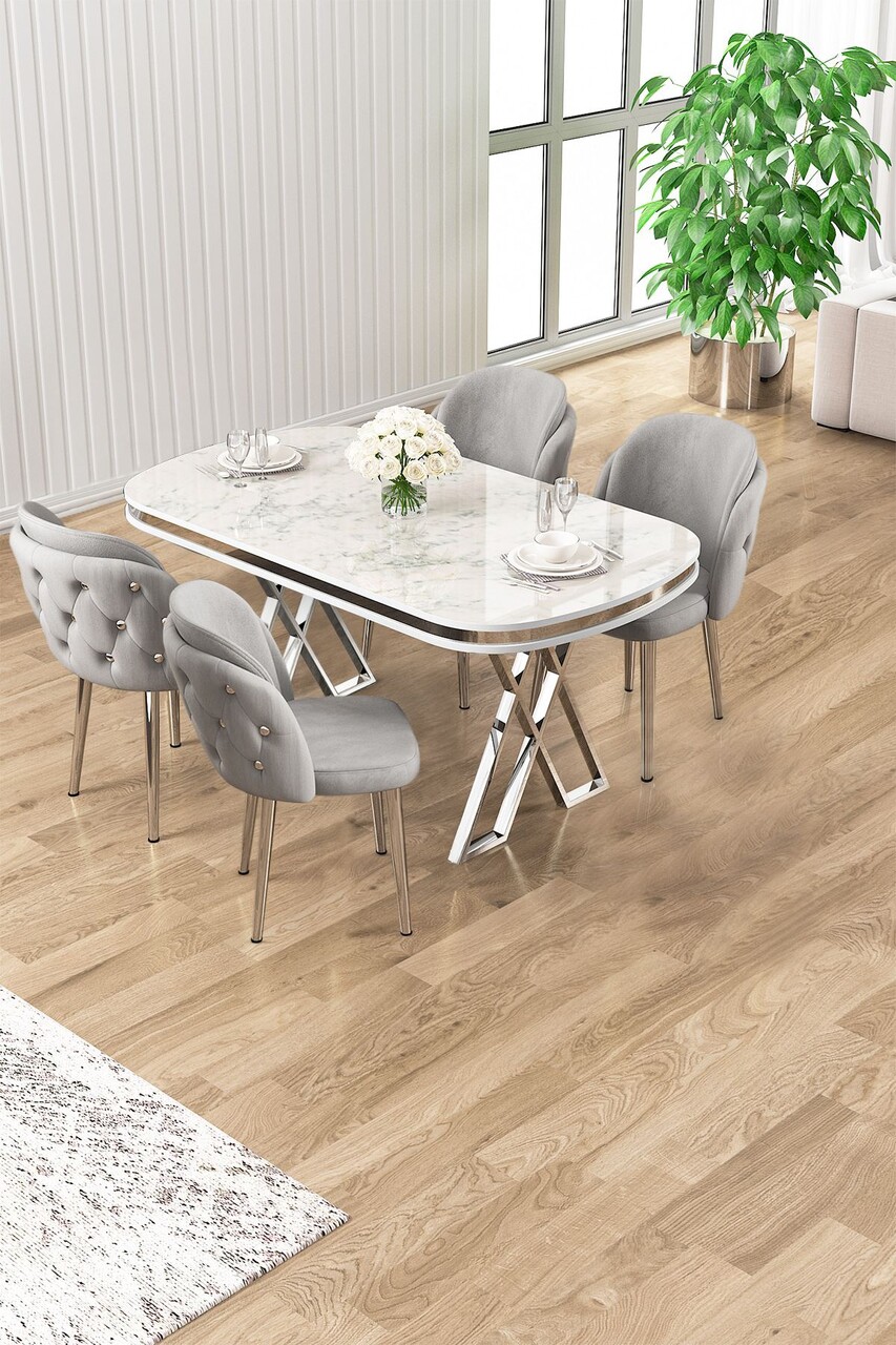 Set masă și scaune (5 bucăți), Hanah Home, Zae, Marmură albă / Crom / Gri