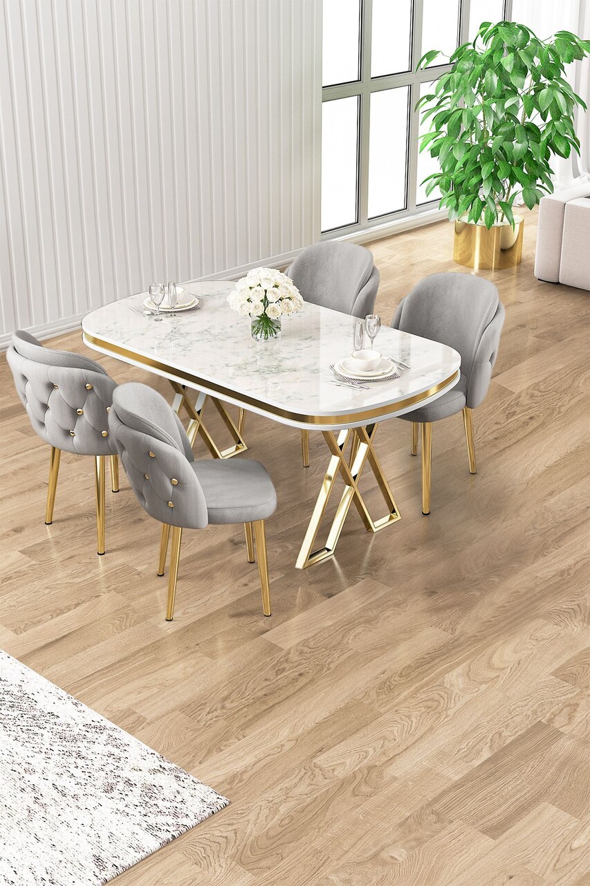 Set masă și scaune (5 bucăți), Hanah Home, Zae, Marmură albă / Auriu / Gri