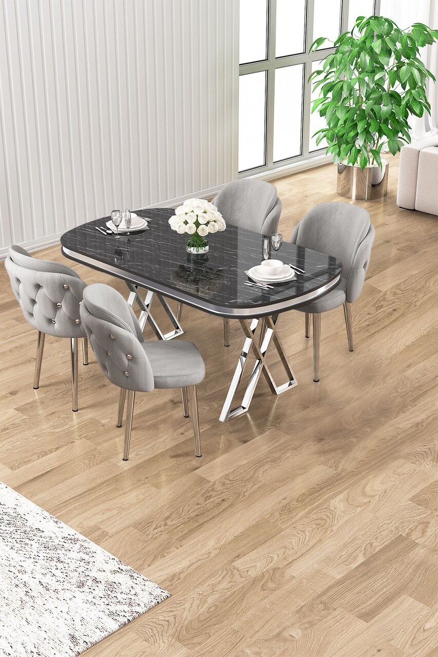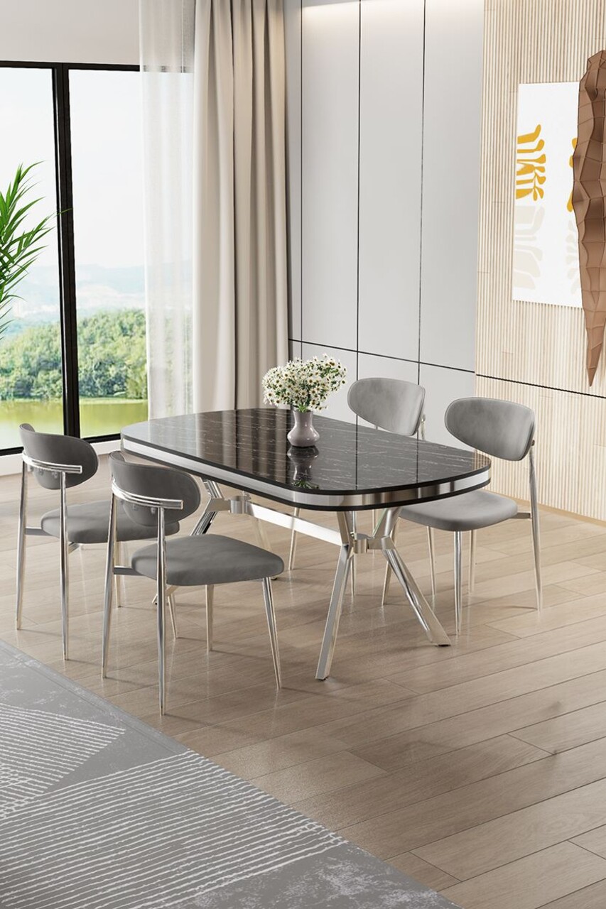 Set masă și scaune (5 bucăți), Hanah Home, Olya, Marmură neagră / Crom / Gri