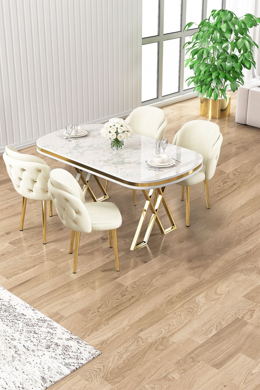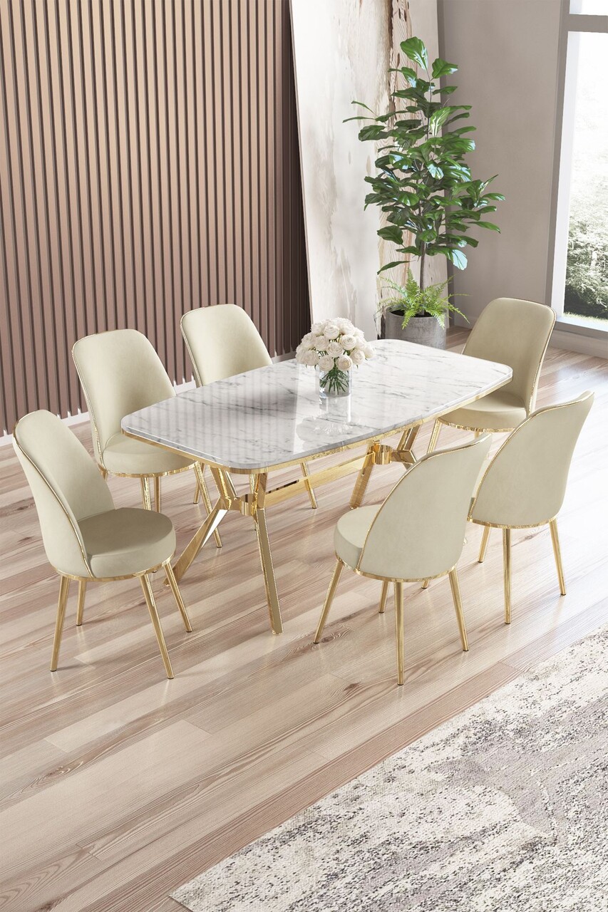 Set masă și scaune (7 piese), Hanah Home, Lena, Marmură albă / Auriu / Crem