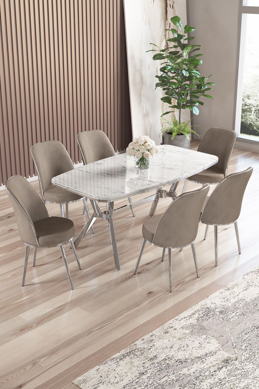 Set masă și scaune (7 piese), Hanah Home, Lena, Marmură albă / Crom / Cappuccino
