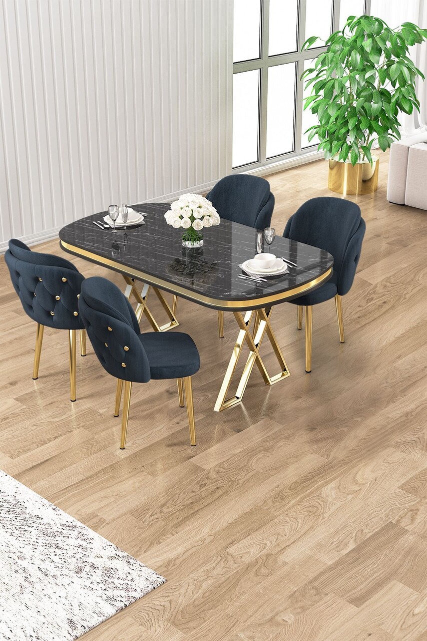 Set masă și scaune (5 bucăți), Hanah Home, Olya, Marmură neagră / Auriu / Negru