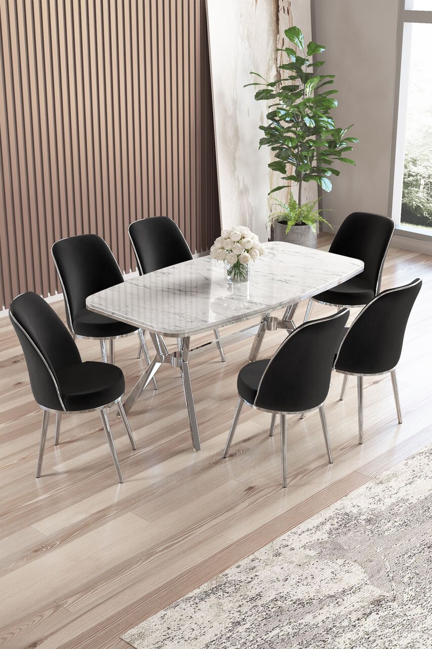 Set masă și scaune (7 piese), Hanah Home, Lena, MARMURĂ ALBĂ CROM / NEGRU