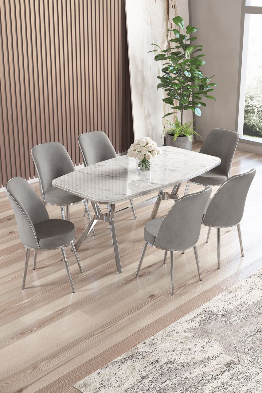 Set masă și scaune (7 piese), Hanah Home, Lena, Marmură albă / Crom / Gri