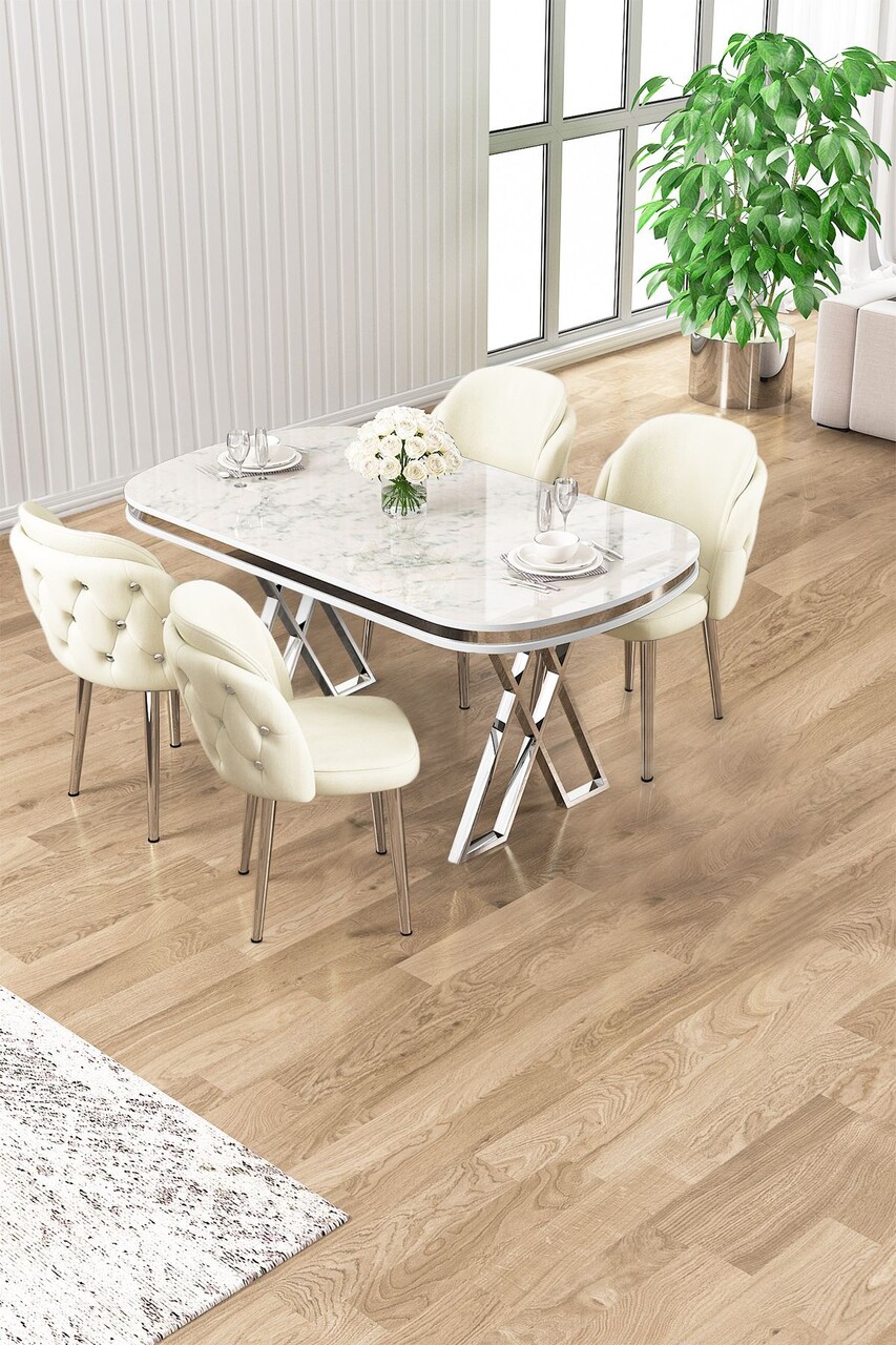 Set masă și scaune (7 piese), Hanah Home, Lena, Marmură albă / Crom / Crem