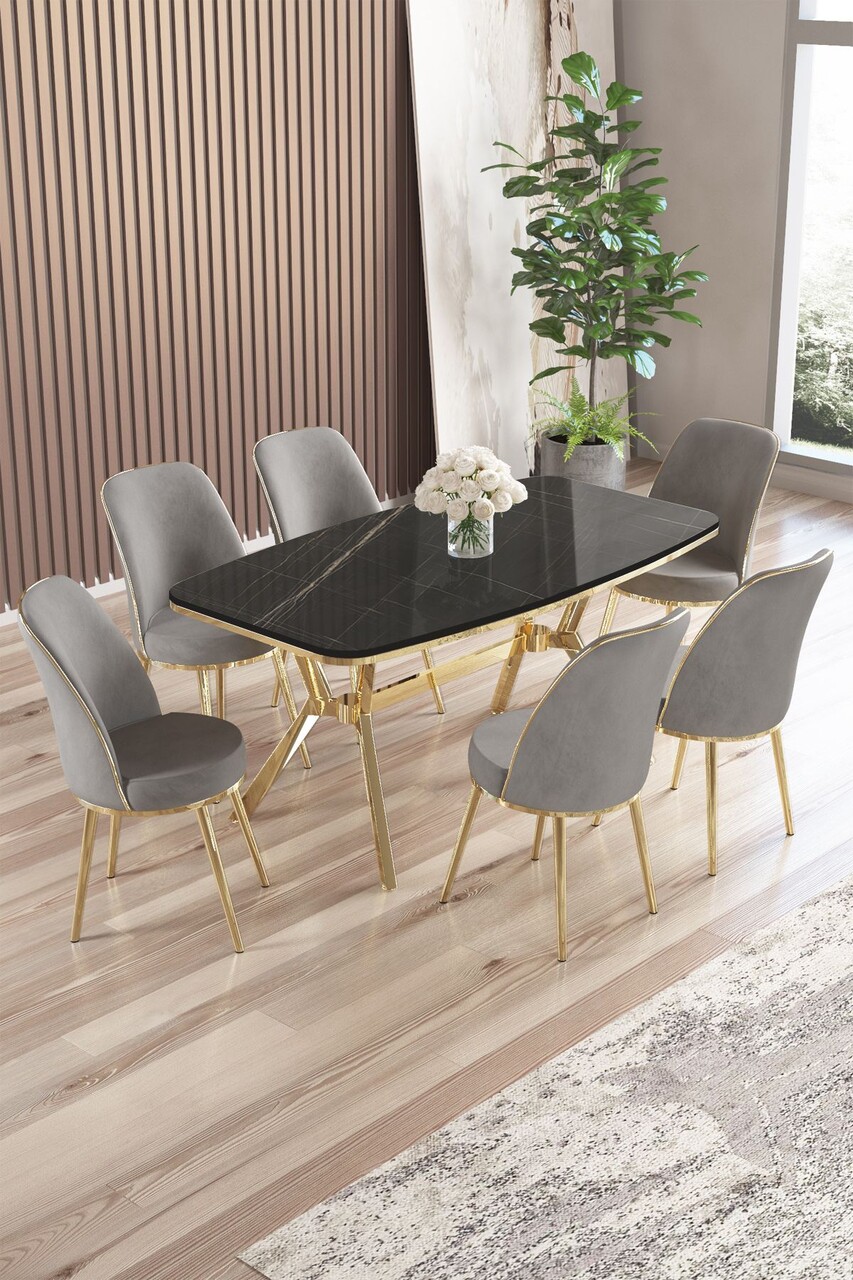 Set masă și scaune (7 piese), Hanah Home, Lena, Marmură neagră / Auriu / Gri