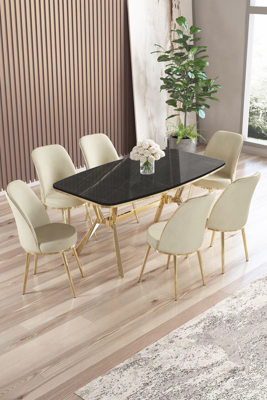 Set masă și scaune (7 piese), Hanah Home, Lena, Marmură neagră / Auriu / Crem