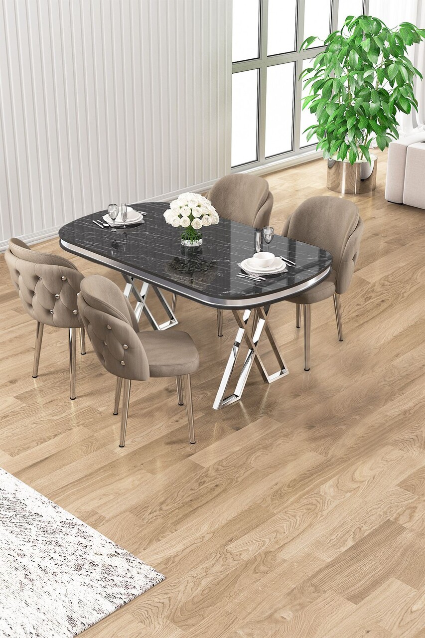 Set masă și scaune (5 bucăți), Hanah Home, Olya, Marmură neagră / Crom / Cappuccino