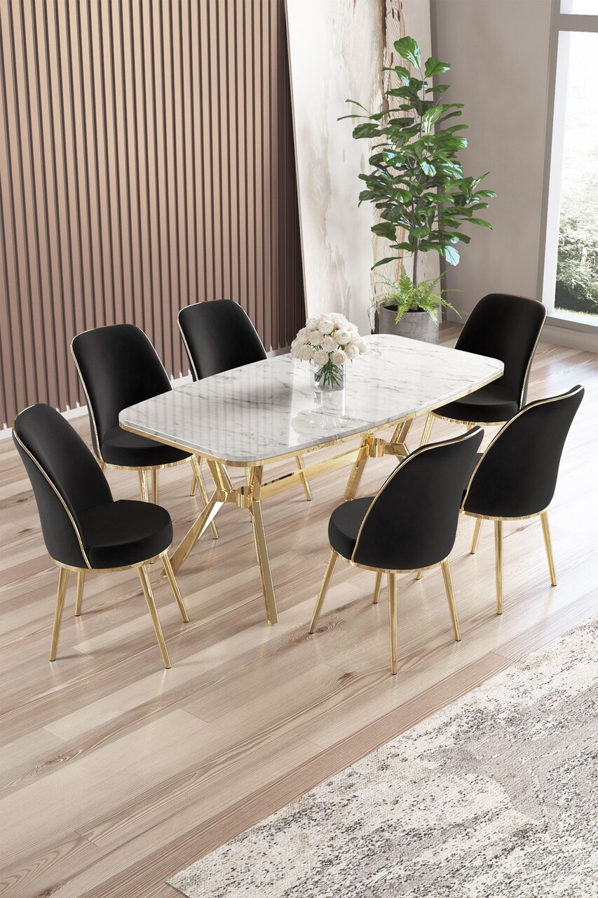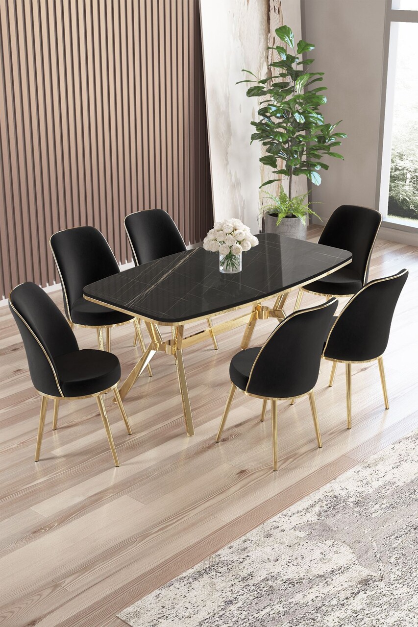 Set masă și scaune (7 piese), Hanah Home, Lena, Marmură neagră / Auriu / Negru