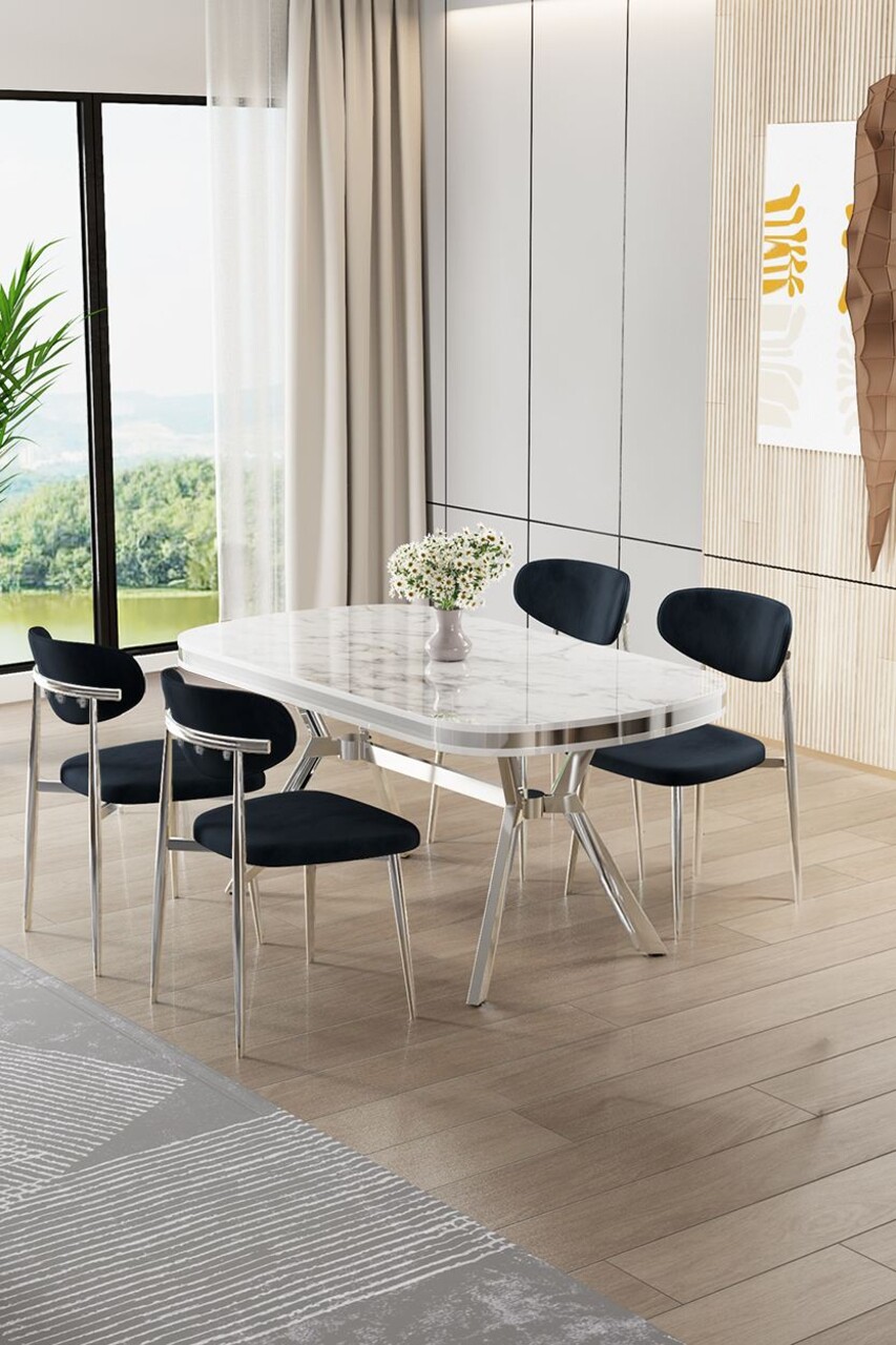 Set masă și scaune (5 bucăți), Hanah Home, Zae, MARMURĂ ALBĂ CROM / NEGRU