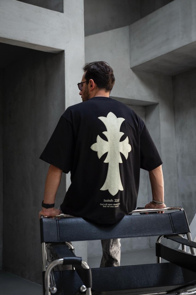 TRICOU OVERSIZE CU PRINT CRUCE SI DESIGN SPATE ISAIAH BLACK TSBI17(1889) (MĂRIME: M)