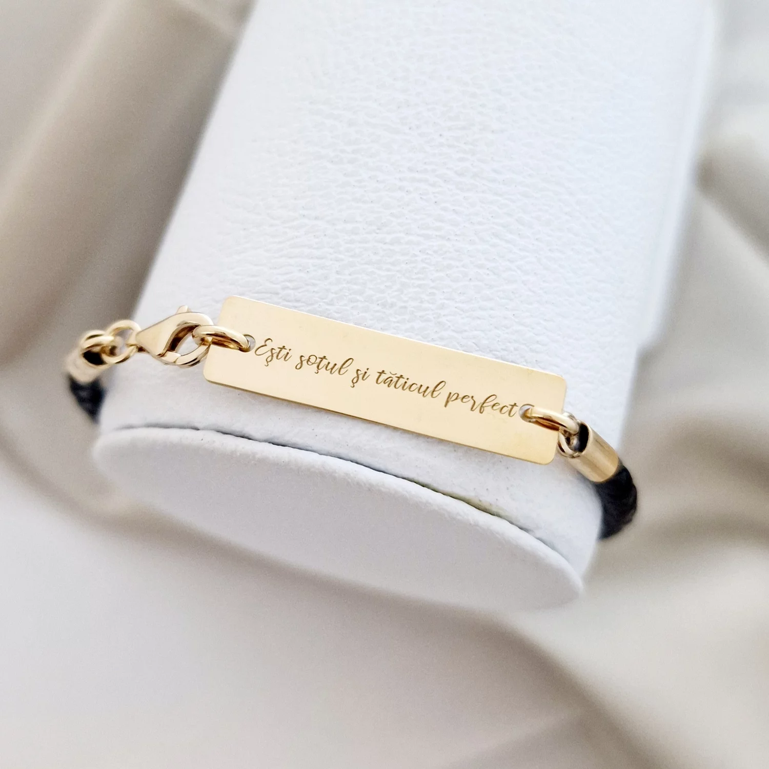 Bratara Placuta gravata cu text - Argint 925 placat cu Aur 18k, piele impletita