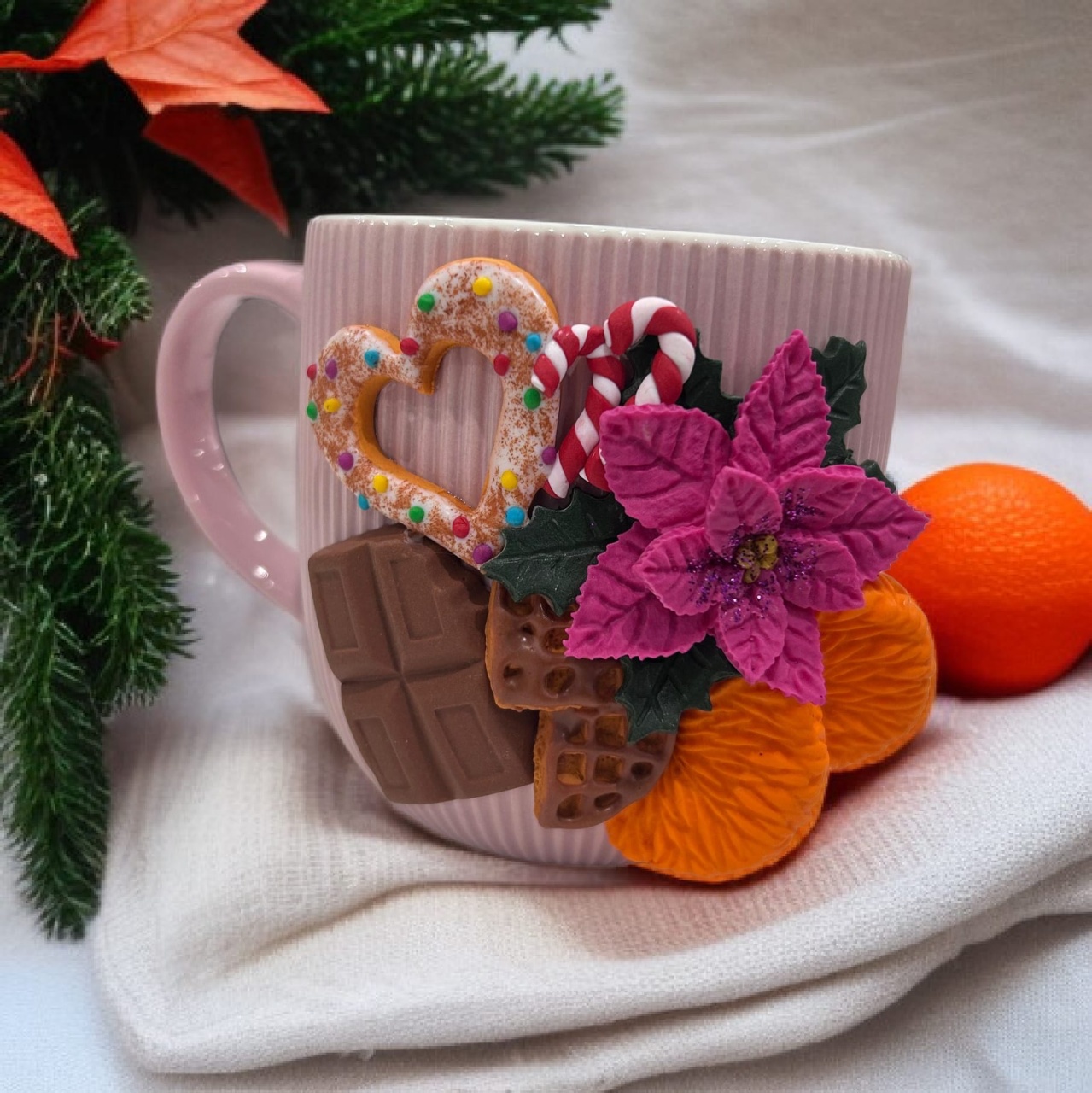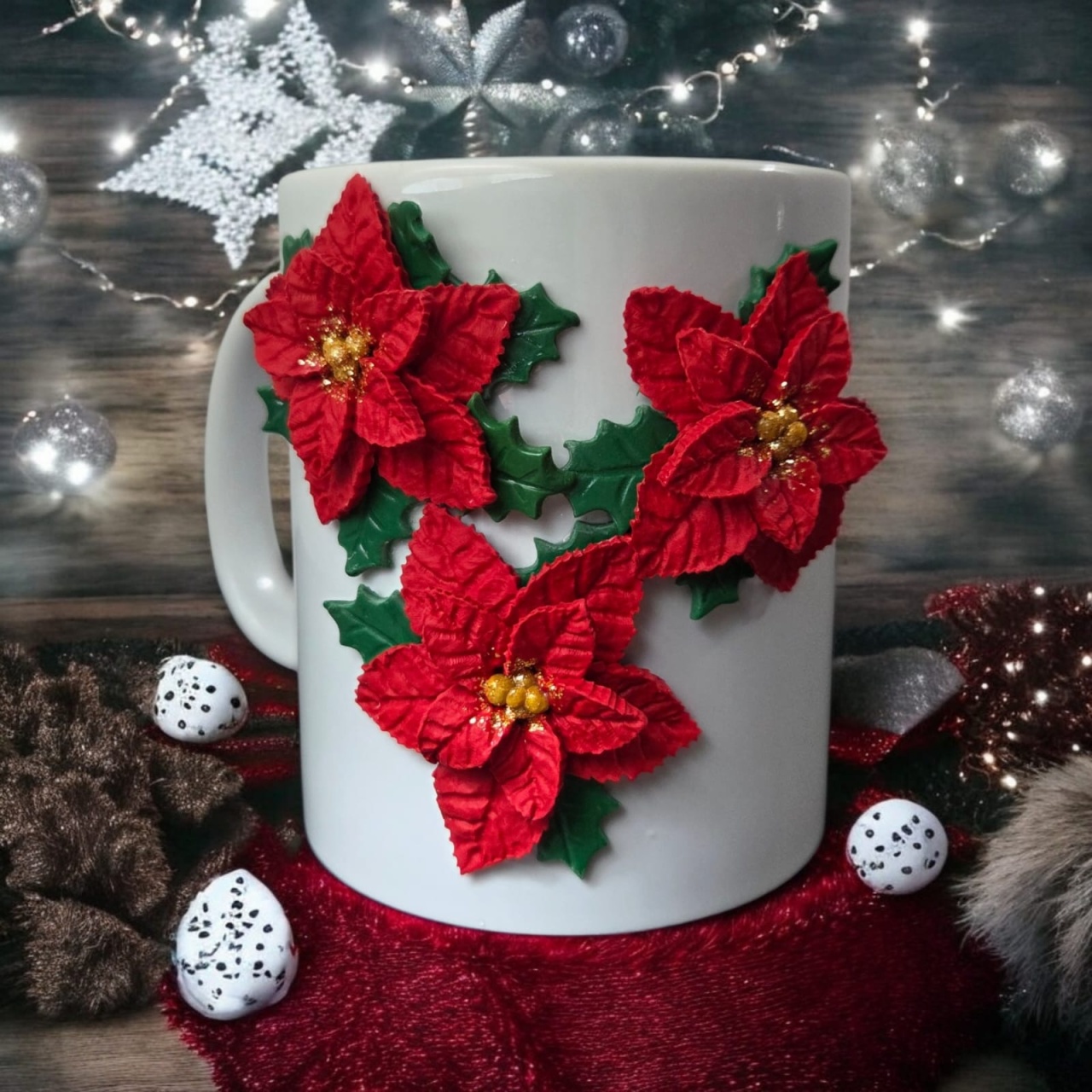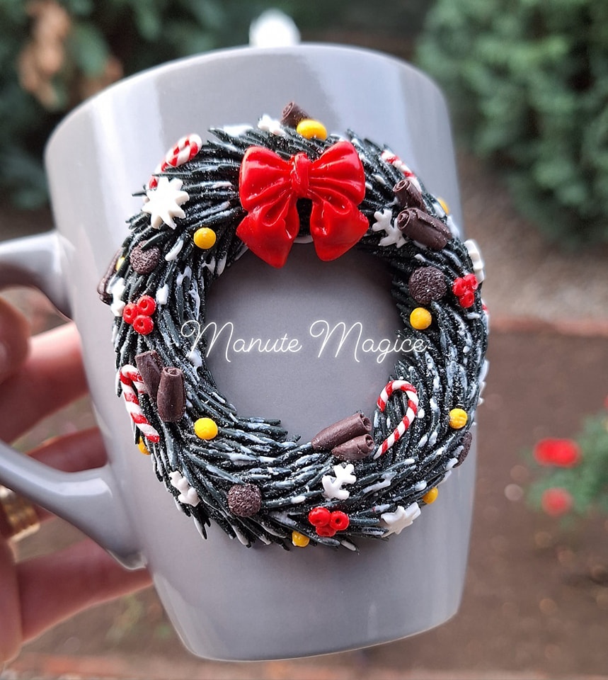 Cană decorată manual din lut polimeric, model handmade „Coroană de Crăciun”