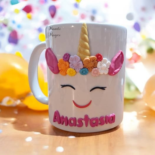Cană realizată manual din lut polimeric - „Unicornul Vesel”