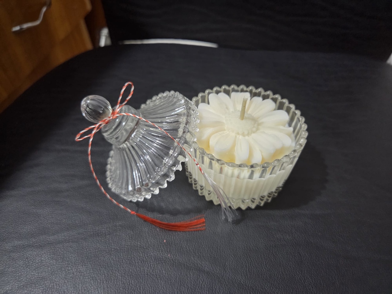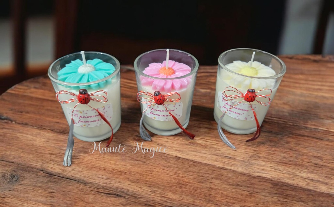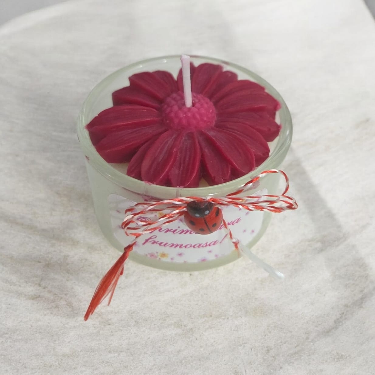 Mărțișor – Lumânare parfumată cu floare decorativă, în recipient din sticlă