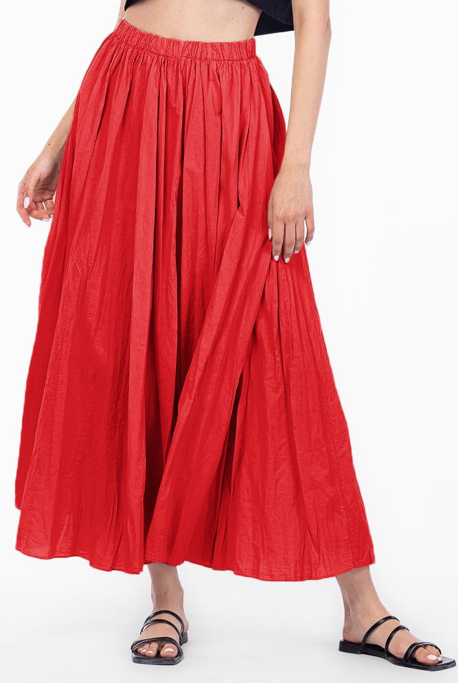 Fusta lunga, ampla, clos, din bumbac creponat, rosie Talie unica
