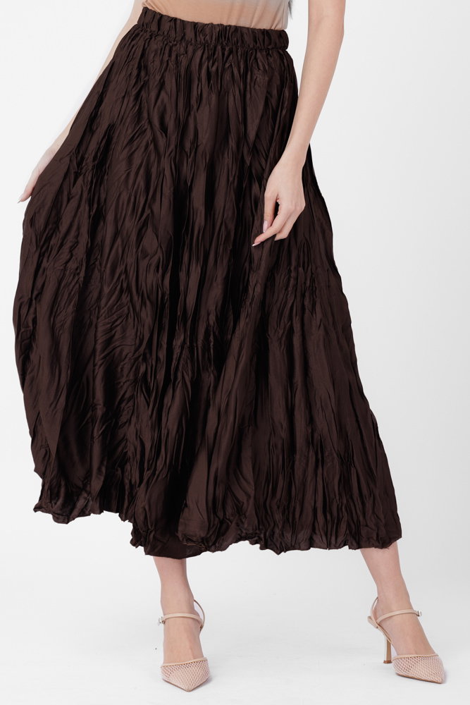 Fusta lunga, ampla, creponata, lucios-satinata, maro Talie unica