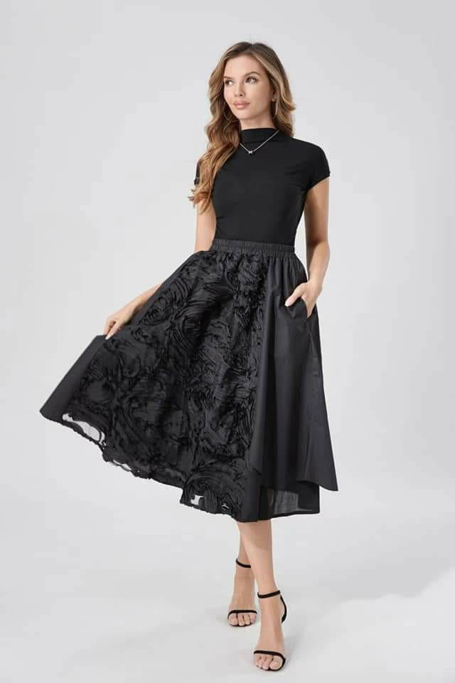 Fusta neagra din bumbac satinat cu aplicatii si falduri Talie unica