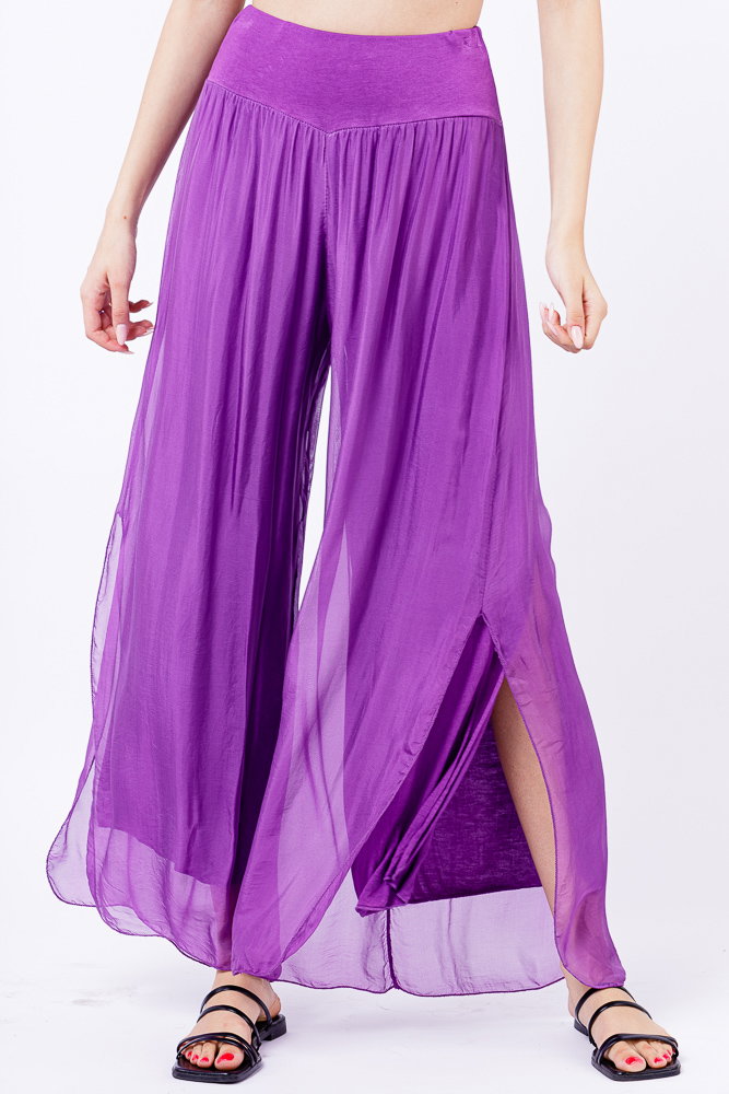 Pantaloni mov din matase si vascoza cu crapaturi laterale Talie unica