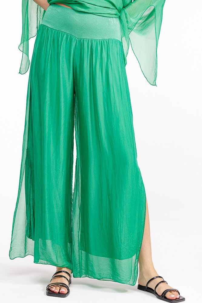 Pantaloni verzi din matase si vascoza, cu crapaturi laterale Talie unica