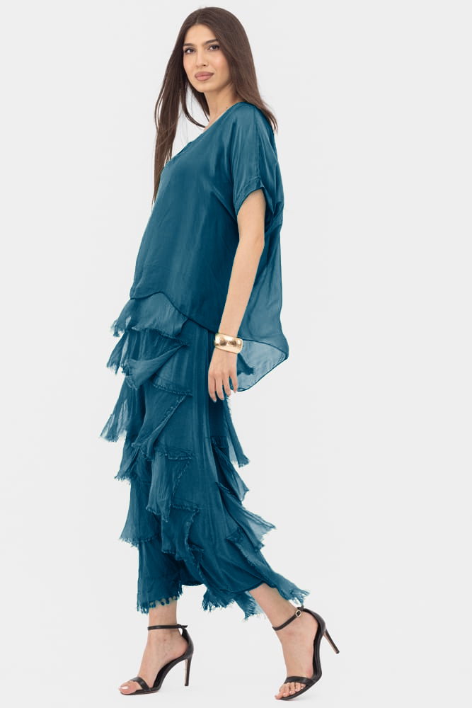 Rochie turcoaz inchis din matase si vascoza cu volane franjurate suprapuse Talie unica