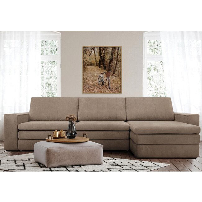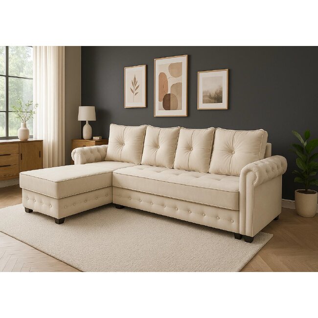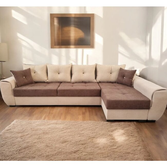 Colțar Acero, extensibil cu ladă depozitare și 4 perne incluse, structură lemn masiv și PAL, stofă premium, 275x174x89 cm, bej