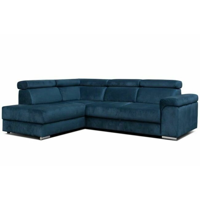 Colțar Carlo L, extensibil cu ladă de depozitare și tetiere reglabile, structură lemn masiv și PAL, 268x206x83 cm, albastru