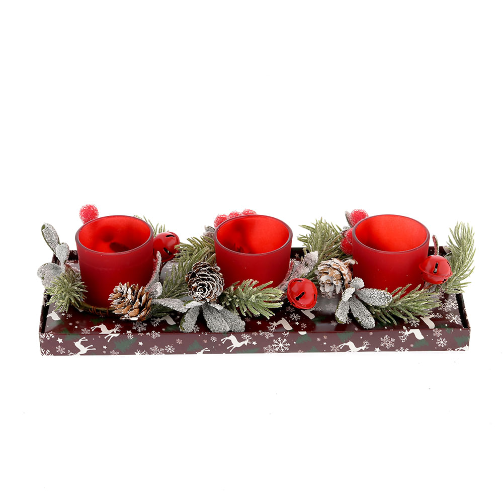 Suport lumanari rosu cu decor de sarbatori si conuri