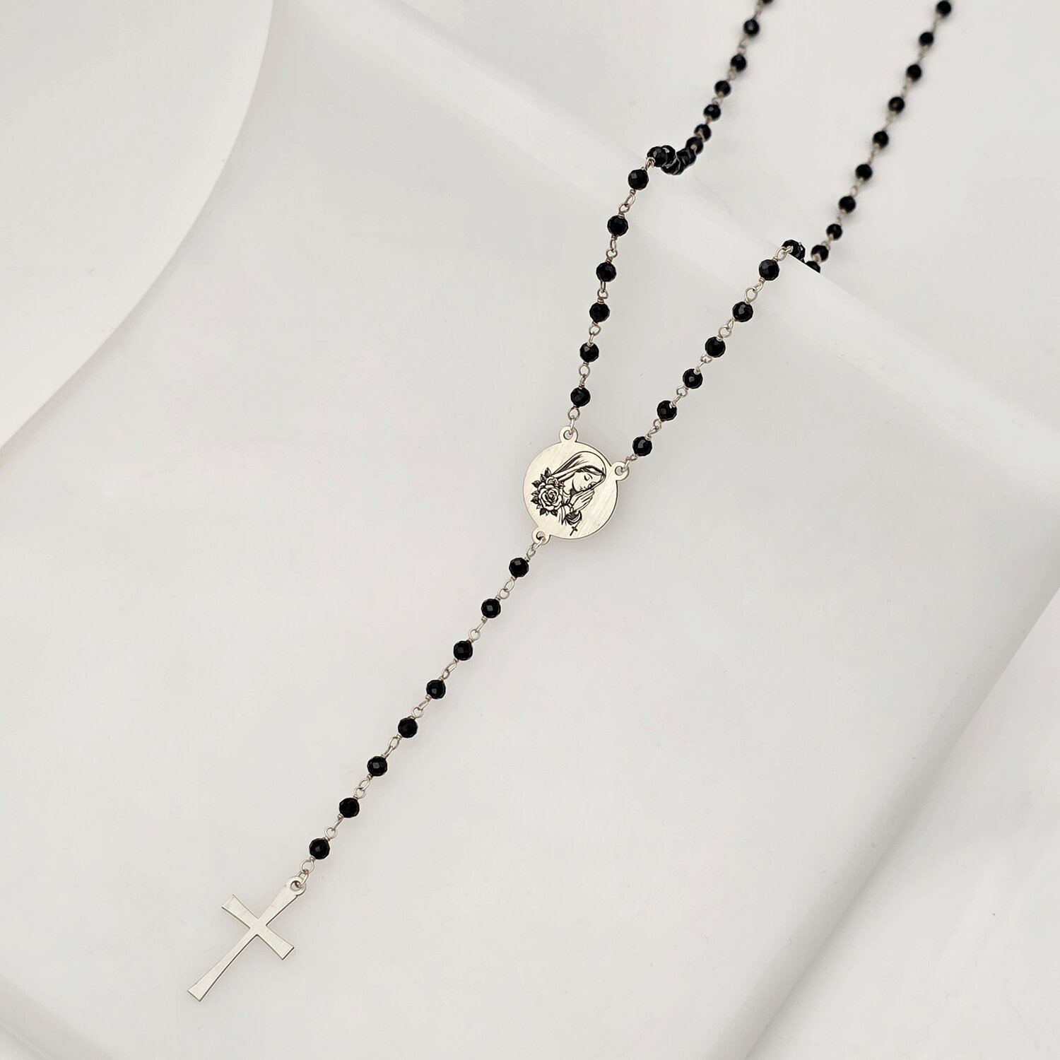 Colier Rozariu - Maica Sfanta & Cruce Mare - Lant cu pietre Onix - Argint 925