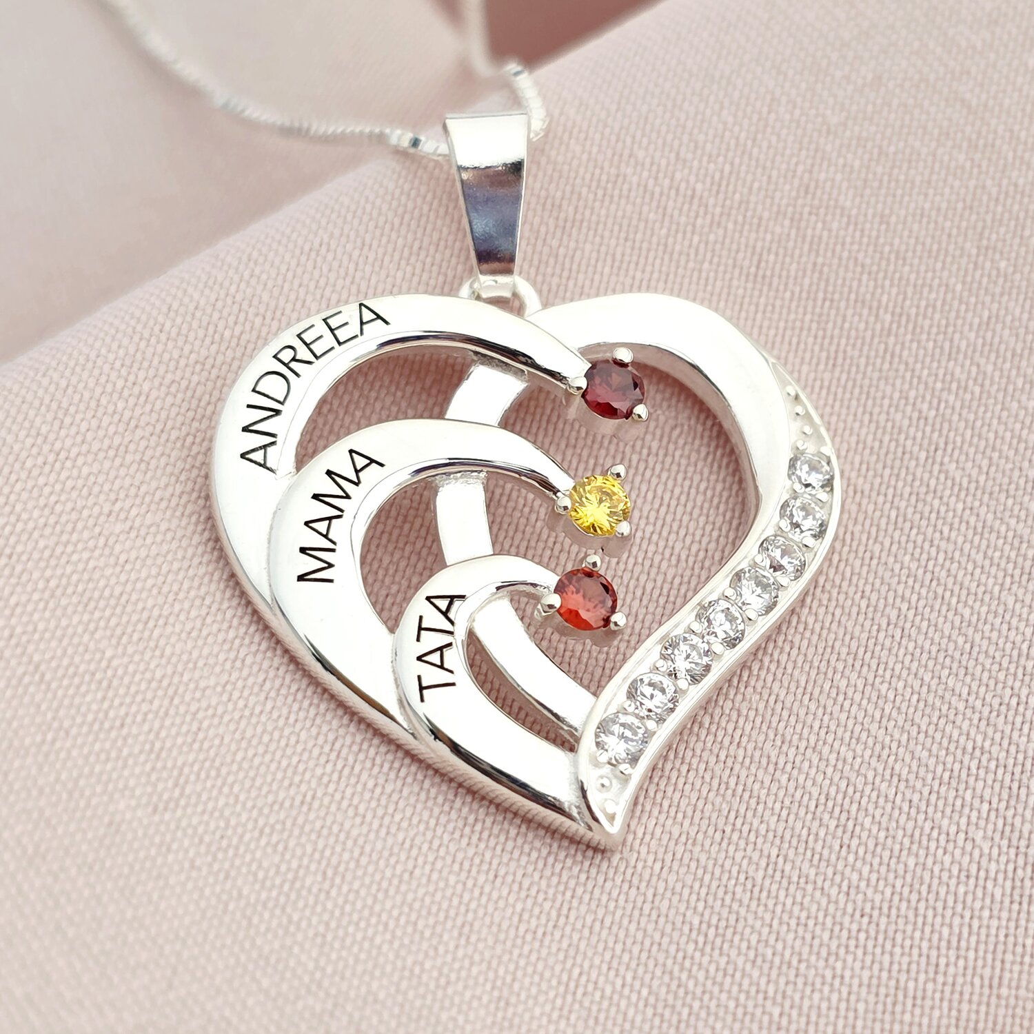 Lantisor Inima cu Poveste - 3 nume si Cristale Zirconia - Argint 925