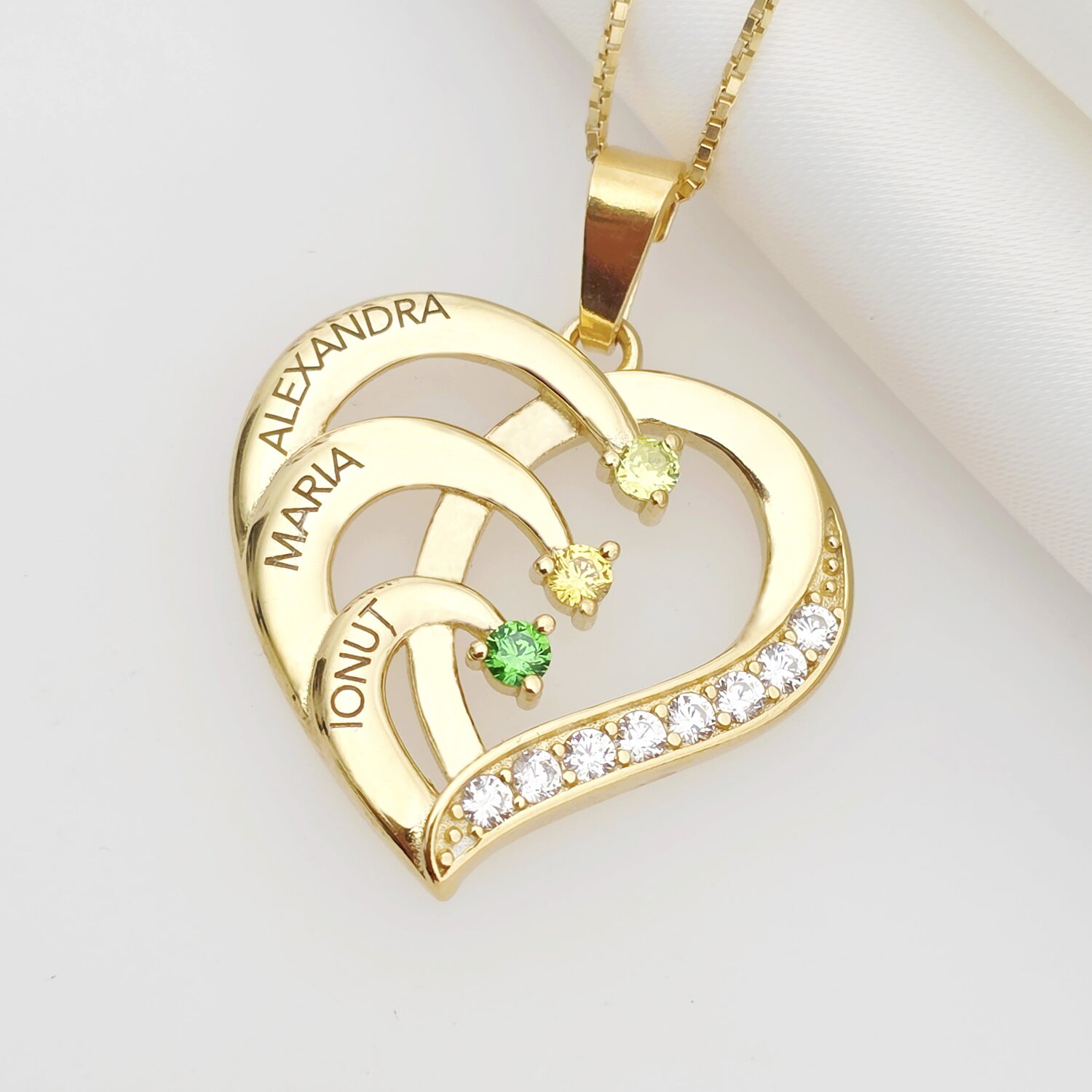 Lantisor Inima cu Poveste - 3 nume si Cristale Zirconia - Argint 925 placat cu Aur 18K