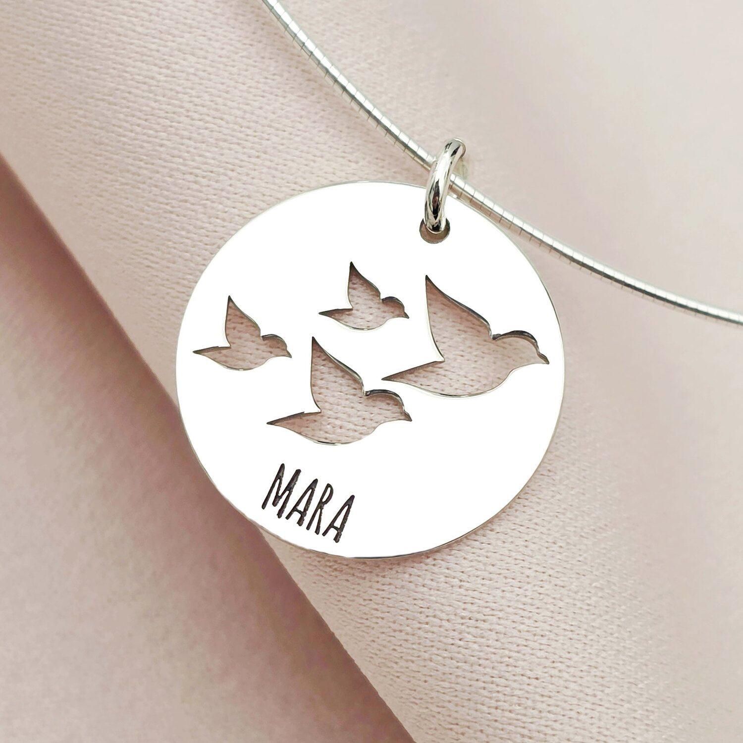 Lantisor fix cu Medalion rotund - personalizat cu Pasari calatoare si Nume personalizat - Argint 925