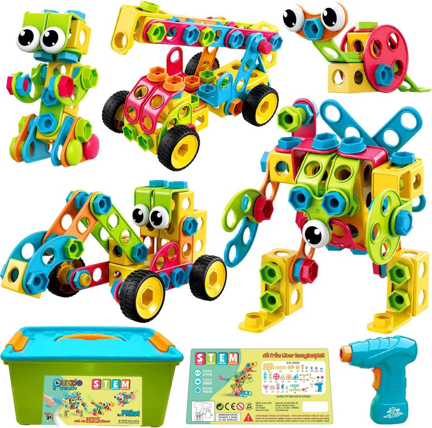 Jucarie educativa si interactiva STEM, Engros cu bormasina pentru inginerie, pentru fete si baieti cu varsta peste 6 ani, 195 piese de constructie puzzle 3D Pitikot®